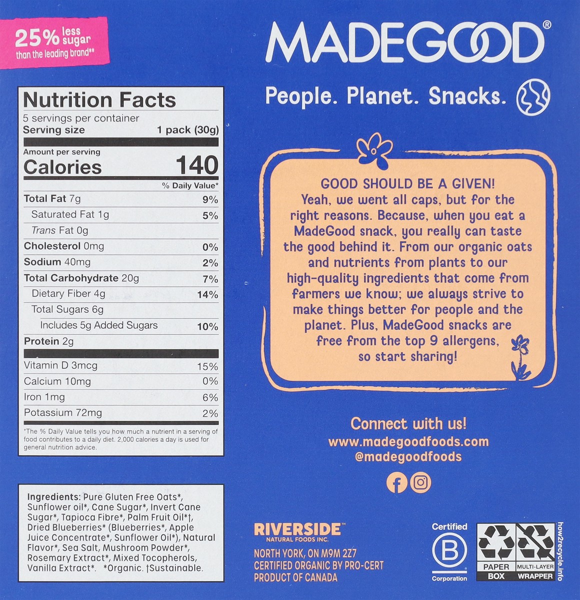 MadeGood Organic Crunchy Blueberry & Vanilla Granola Squares - 5 x 1.06 oz Packs