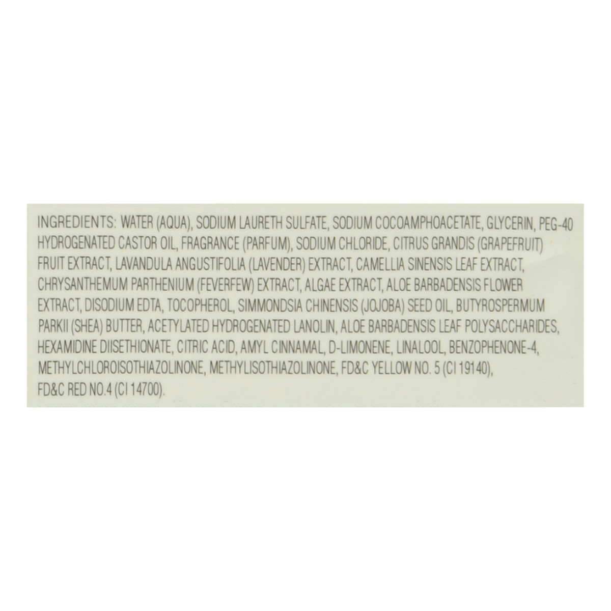 Water (Aqua), Sodium Laureth Sulfate, Sodium Cocoamphoacetate, Glycerin, PEG-40 Hydrogenated Castor Oil, Fragrance (Parfum), Sodium Chloride, Citrus Grandis (Grapefruit) Fruit Extract, Lavandula Angus…