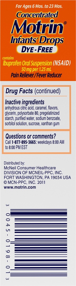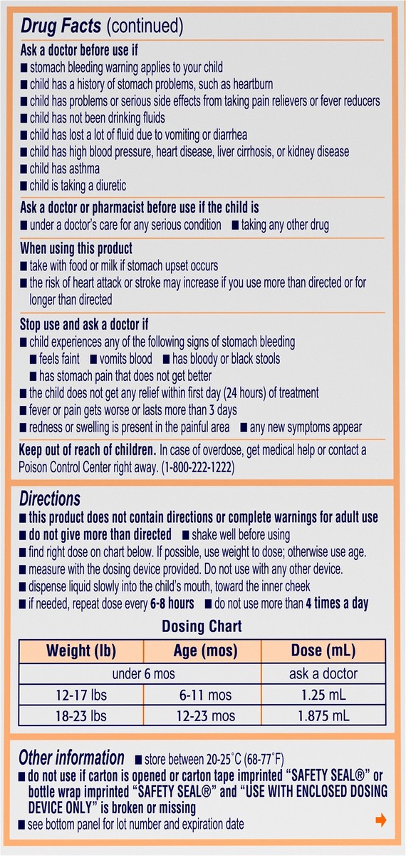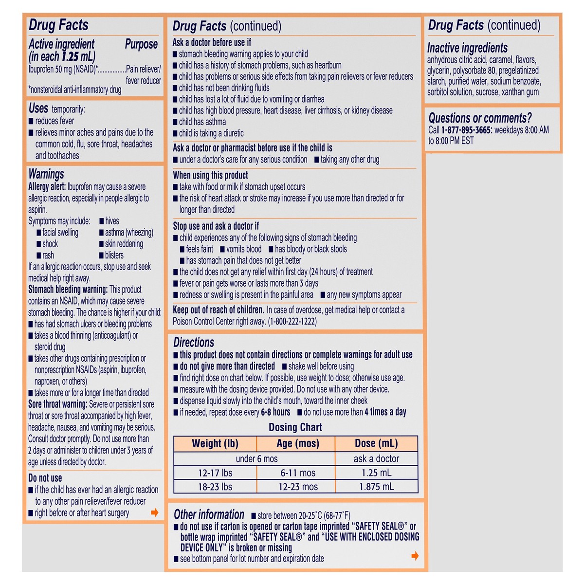 Active Ingredient (in each 1.25 mL): Ibuprofen 50 mg (NSAID)* *nonsteroidal anti-inflammatory drug Inactive Ingredients: anhydrous citric acid, caramel, flavors, glycerin, polysorbate 80, pregelatiniz…