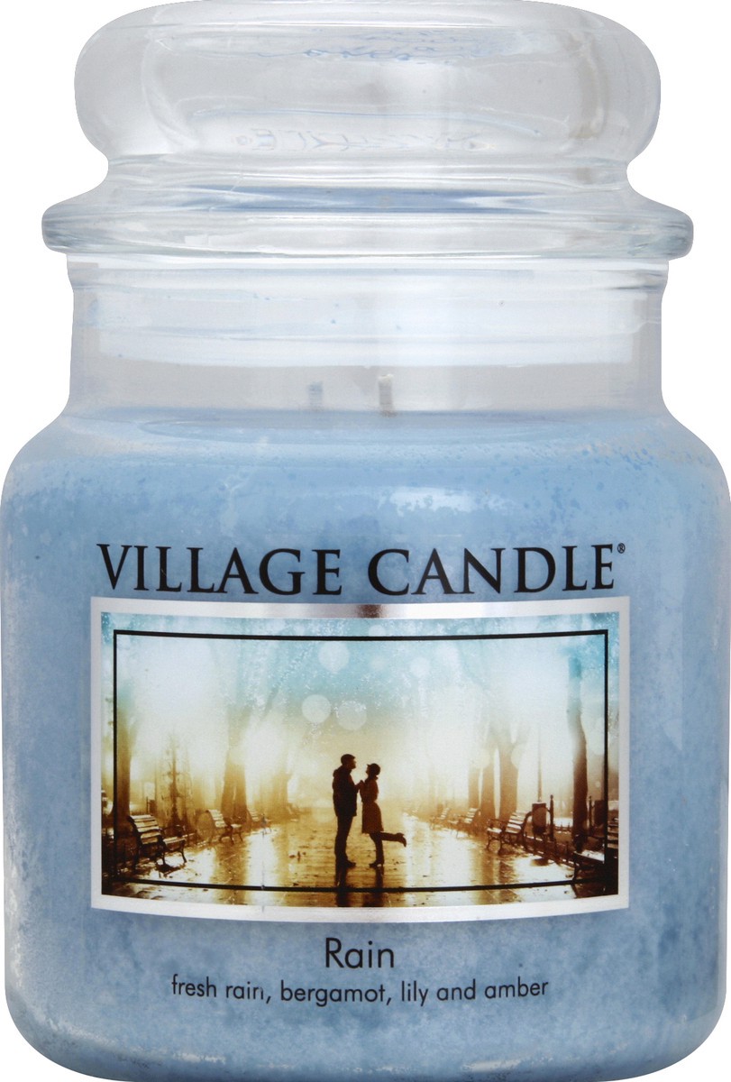 Fresh rain, bergamot, lily and amber. 16 fl oz. Approx burn time is up to 105 hours. www.villagecandle.com. Made in Wells, Maine USA.