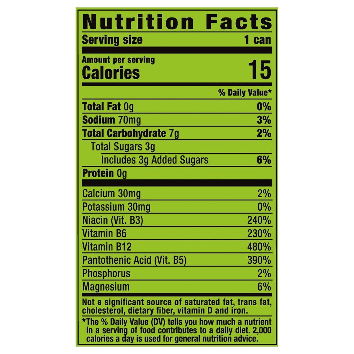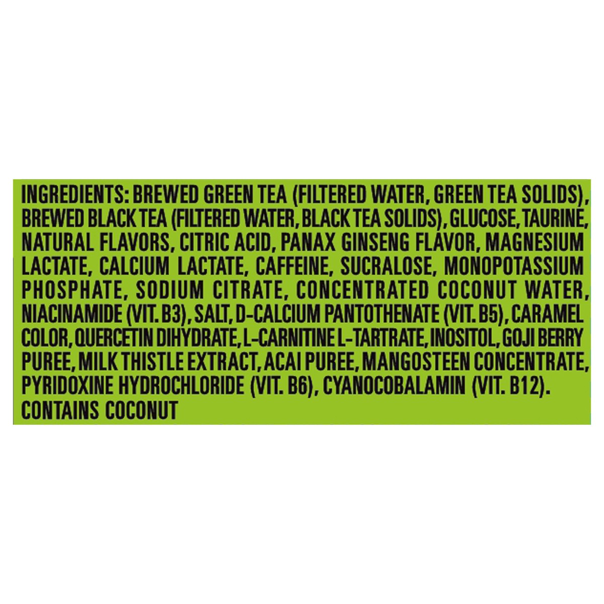 Brewed Green Tea (Filtered Water, Green Tea Solids), Brewed Black Tea (Filtered Water, Black Tea Solids), Glucose, Taurinė, Natural Flavors, Citric Acid, Panax Ginseng Flavor, Magnesium Lactate, Calci…