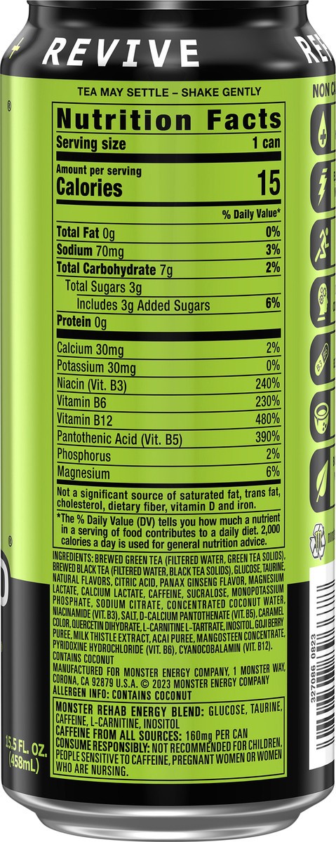 Vitamins B3; B5; B6; B12. Monster Rehab Energy Blend: glucose, taurine, caffeine, L-carnitine, inositol. Caffeine From All Sources: 160mg per can. Refresh + Recover + Revive. Non corbonated. Advanced …