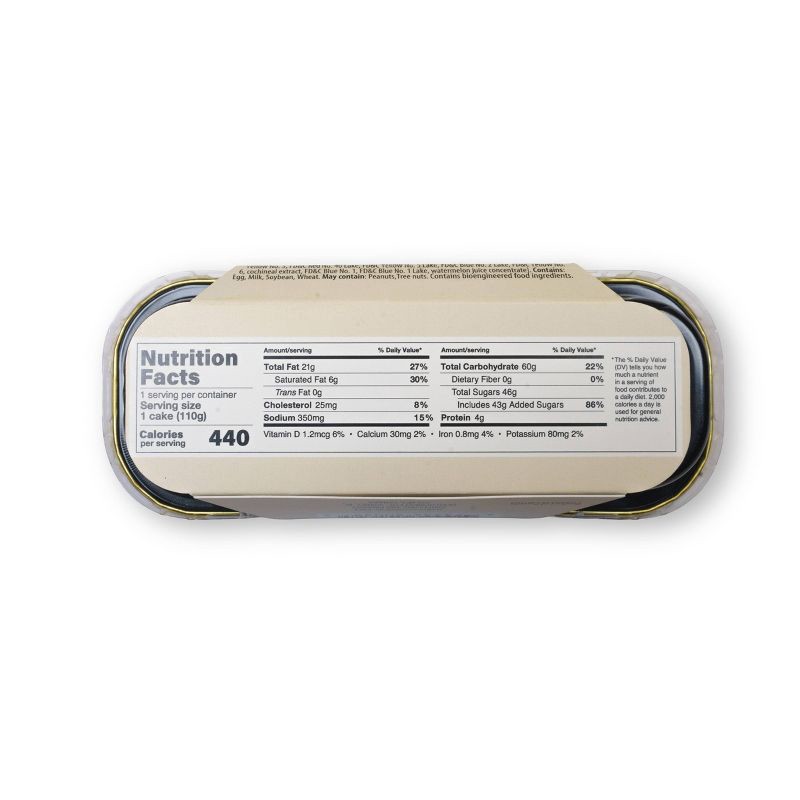 Cake [water, bleached wheat flour, sugar, liquid whole egg, canola oil, baking powder, propylene glycol mono fatty acid ester, mono and diglycerides, whey protein concentrate, dried egg white, salt, n…
