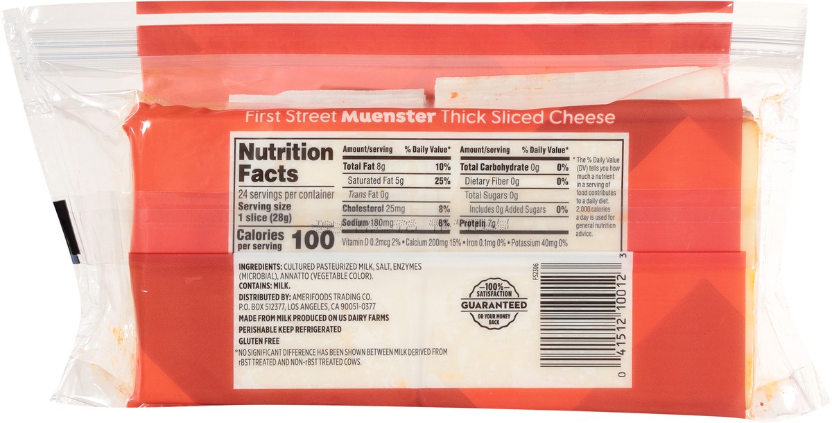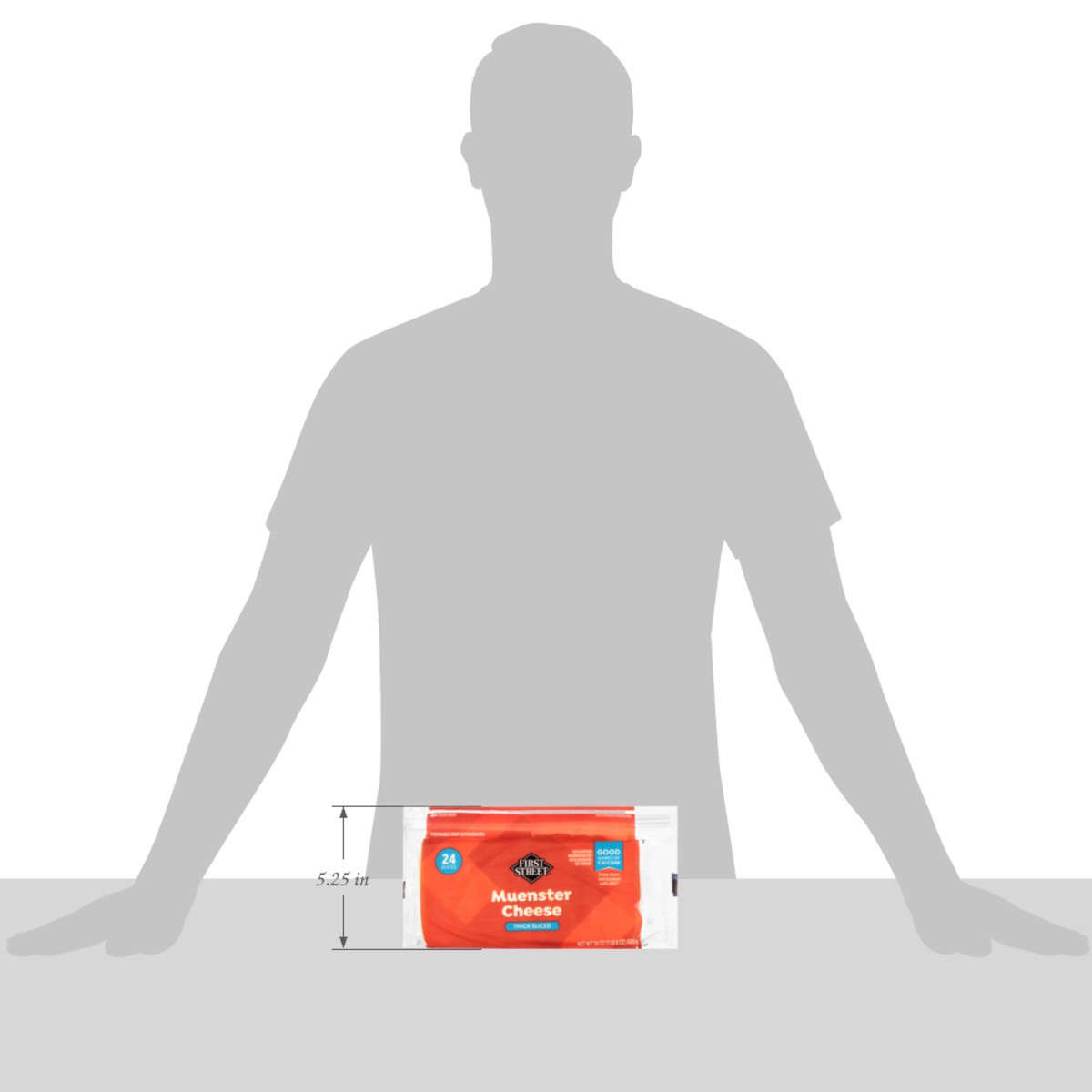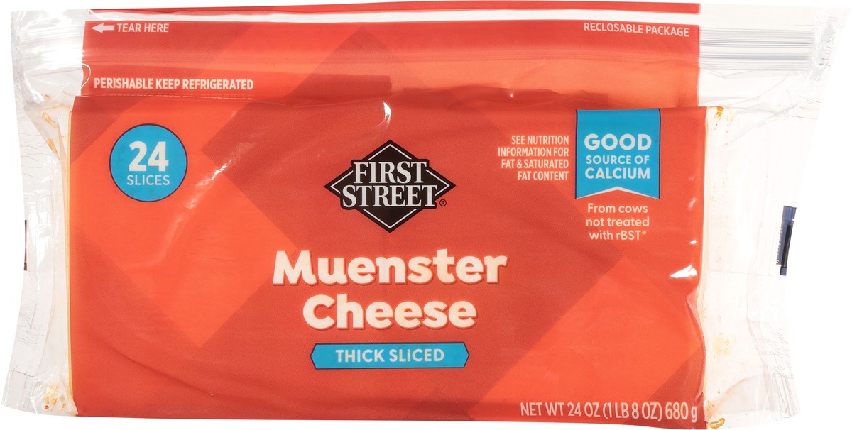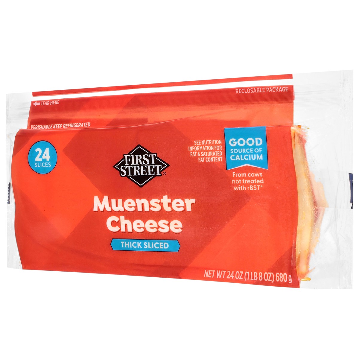 First Street Sliced Muenster Cheese, Mild and mellow. First Street Sliced Muenster Cheese has a smooth texture and a distinctive orange rind. It melts beautifully, making it excellent for grilled chee…
