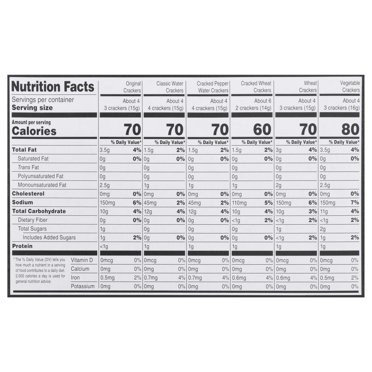 Vegetable Crackers: Vegetable Crackers: Enriched Flour (Wheat Flour, Niacin, Reduced Iron, Thiamin Mononitrate, Riboflavin, Folic Acid), High Oleic Sunflower Oil, Sugar, Dehydrated Vegetable and Seaso…