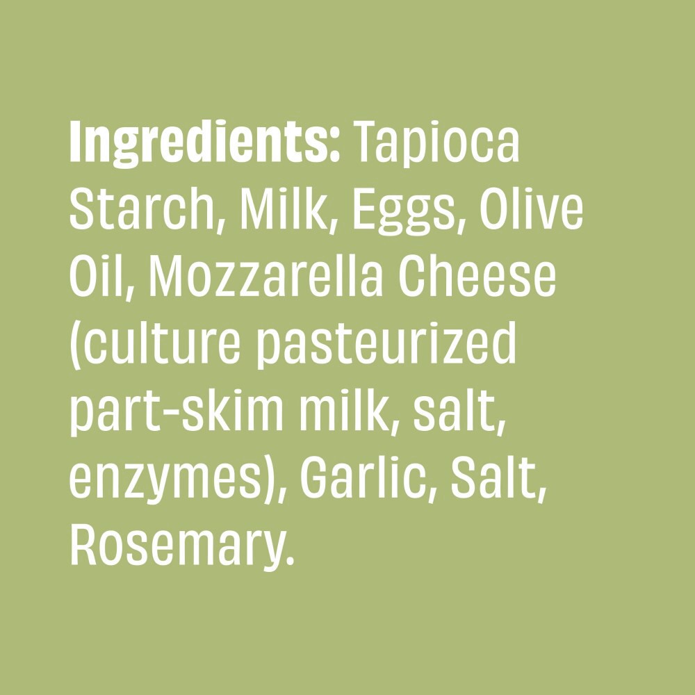 Tapioca Starch, Water, Egg, Avocado Oil and/or Olive Oil, Milk, Mozzarella Cheese (Culture Pasteurized Part-Skim Milk, Salt, Enzymes), Garlic, Salt, Rosemary.