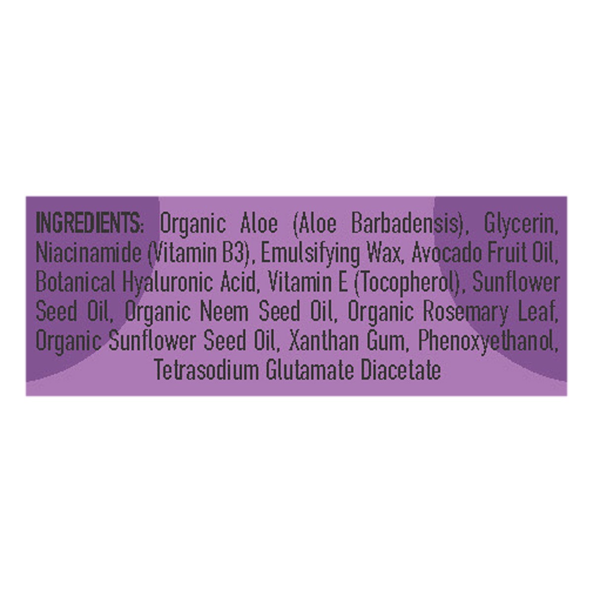 Organic Aloe (Aloe Barbadensis), Glycerin, Niacinamide (Vitamin B3), Emulsifying Wax, Avocado Fruit Oil, Botanical Hyaluronic Acid, Vitamin E (Tocopherol), Sunflower Seed Oil, Organic Neem Seed Oil, O…