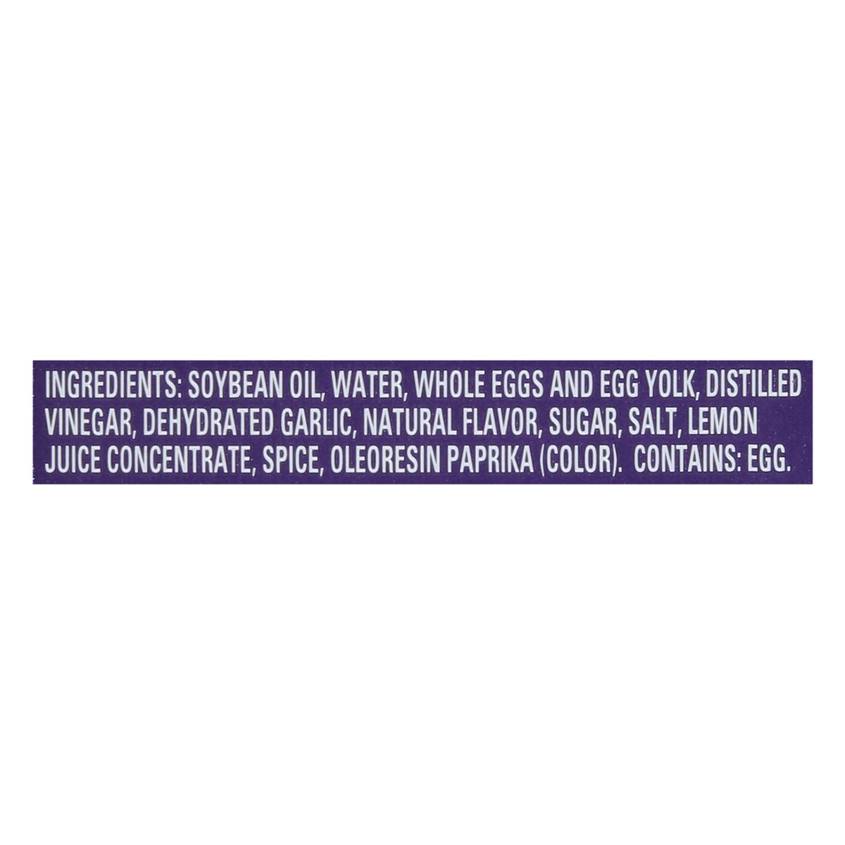 Soybean Oil, Water, Whole Eggs and Egg Yolk, Distilled Vinegar, Dehydrated Garlic, Natural Flavor, Sugar, Salt, Lemon Juice Concentrate, Spice, Oleoresin Paprika (Color).