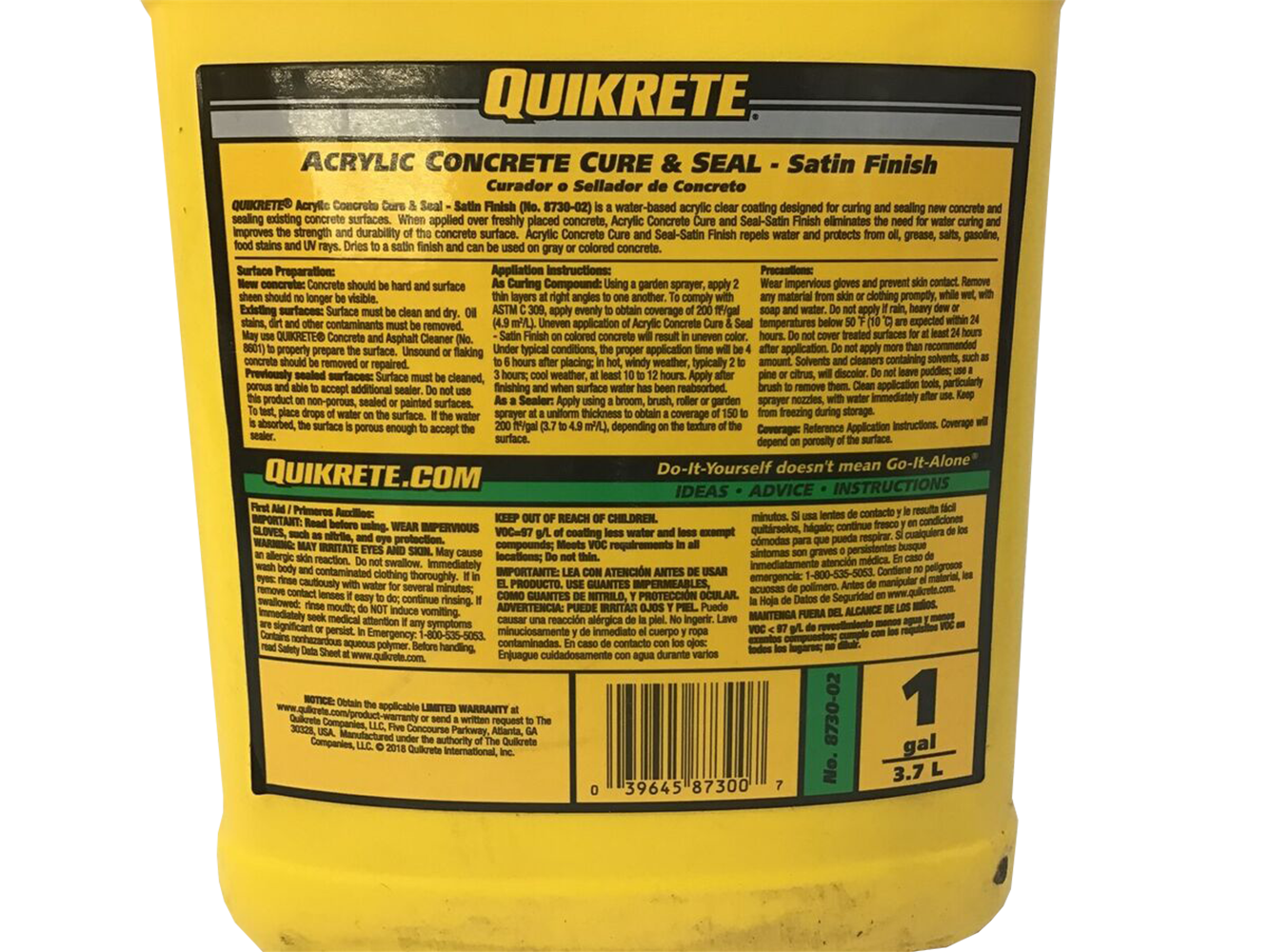 Water-based Acrylic clear coating designed for curing and sealing new concrete and sealing existing concrete.. Satin Finish. Highly water resistant clear coating.