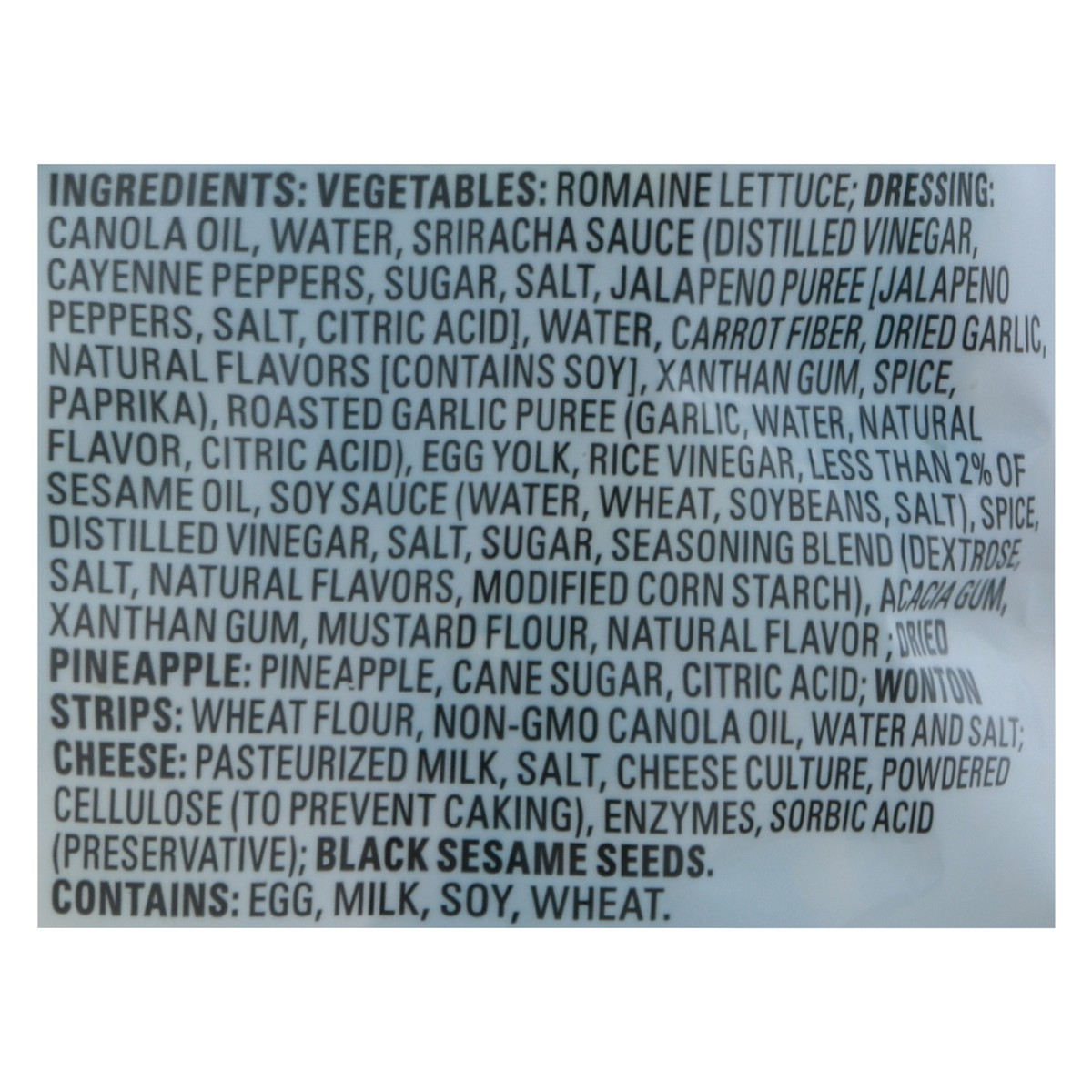Vegetables: Romaine Lettuce; Dressing: Canola Oil, Water, Sriracha Sauce (Distilled Vinegar, Cayenne Peppers, Sugar, Salt, Jalapeno Puree [Jalapeno Peppers, Salt, Citric Acid], Water, Carrot Fiber, Dr…