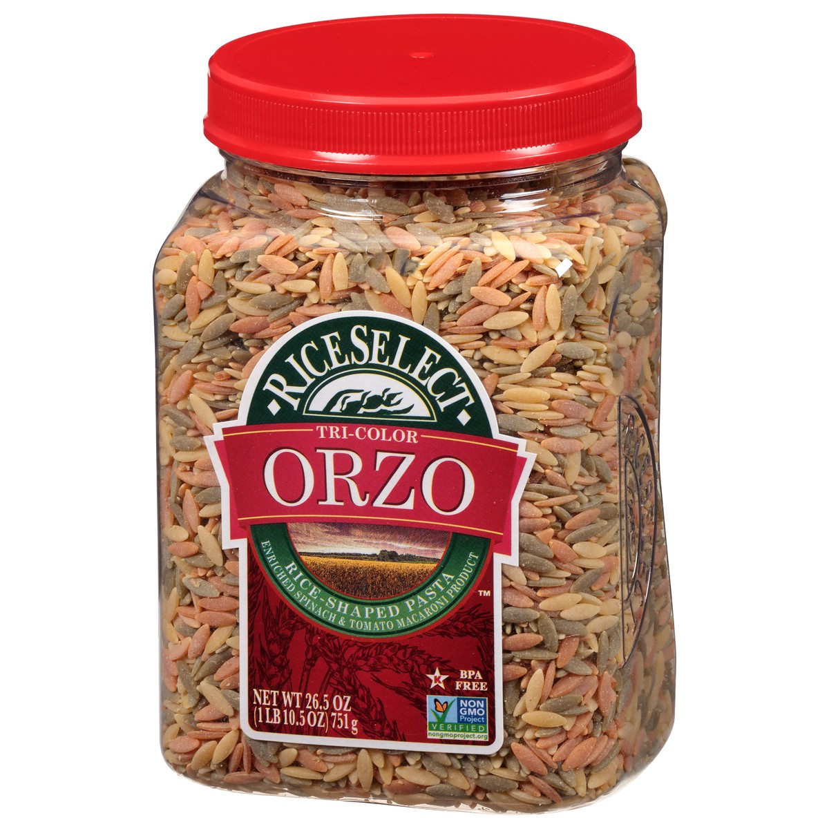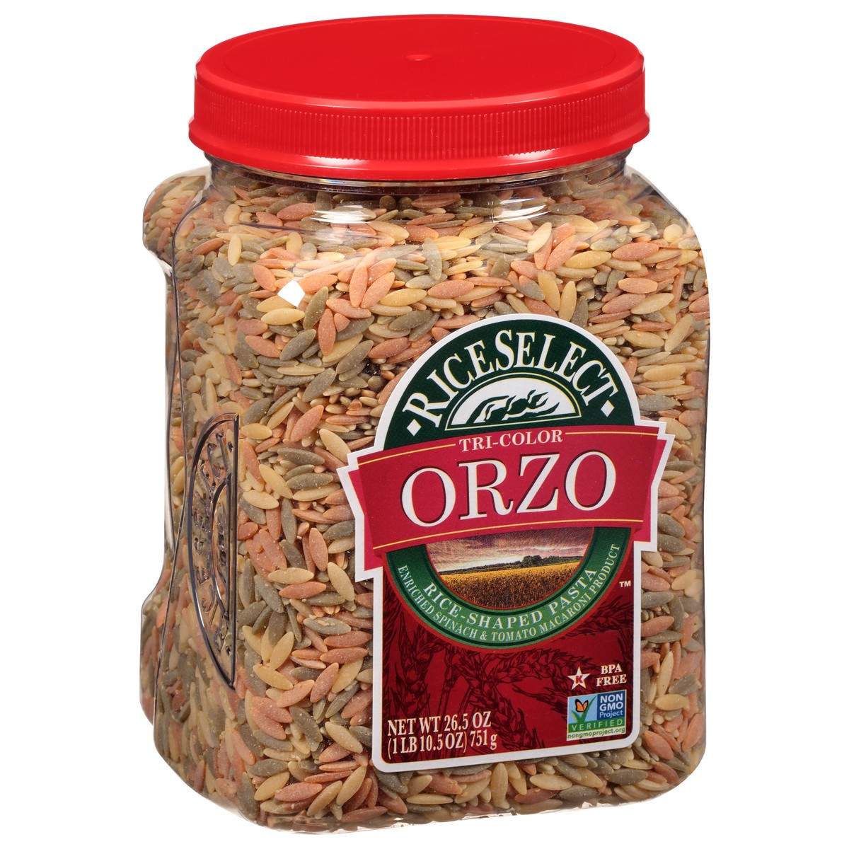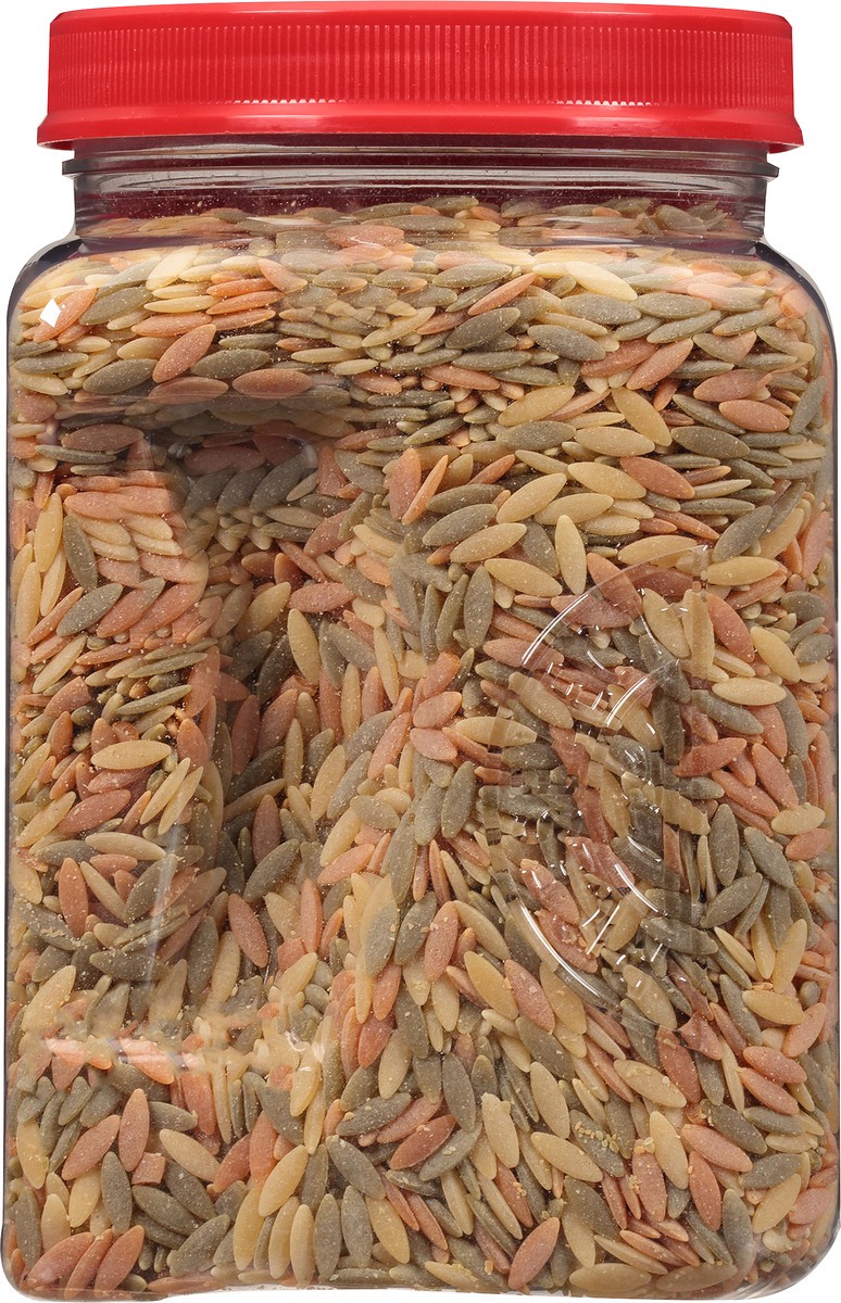 - Our tomato and spinach-flavored tri-color orzo is easy to pour and store