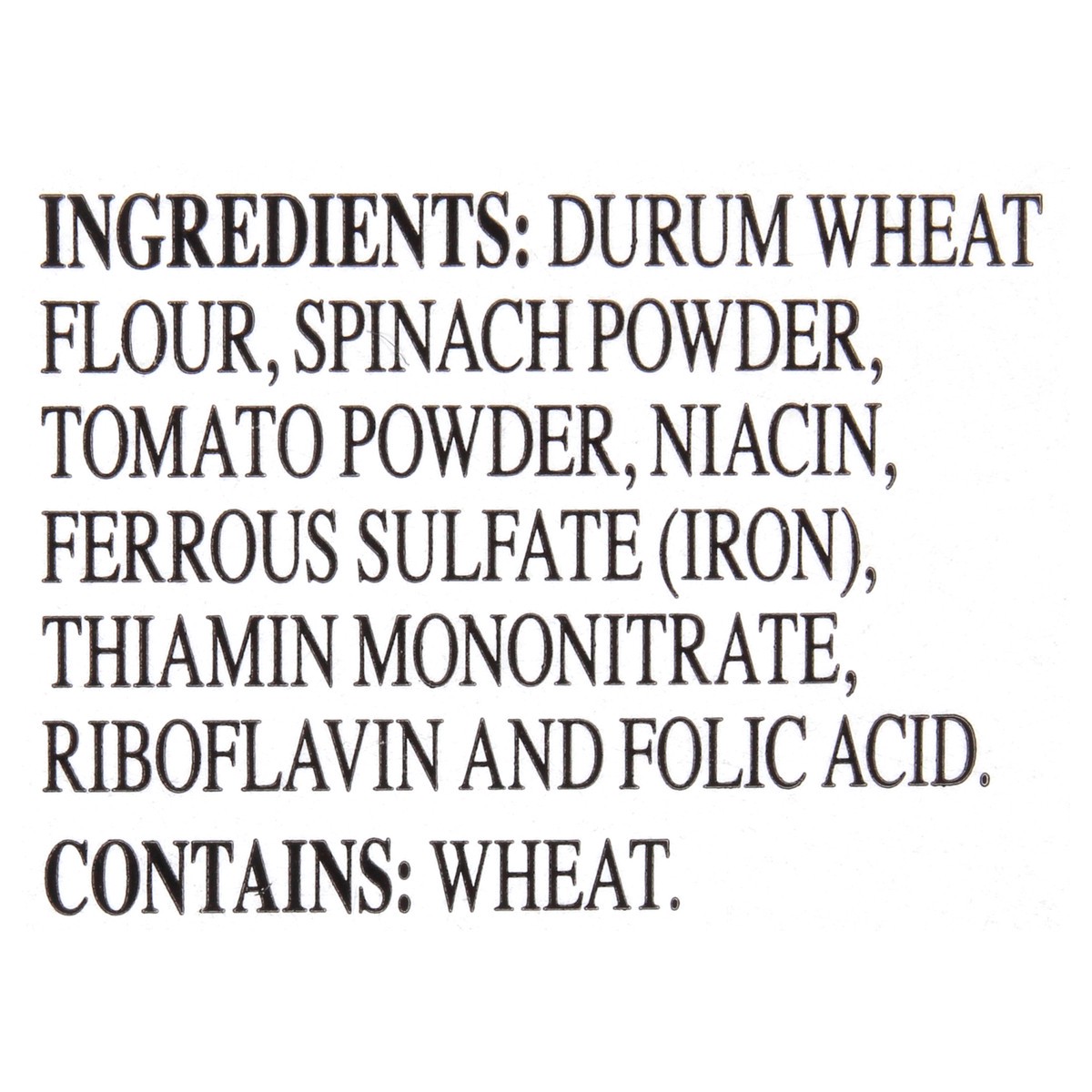 Durum Wheat Flour, Spinach Powder, Tomato Powder, Niacin, Ferrous Sulfate (Iron), Thiamin Mononitrate, Riboflavin and Folic Acid.