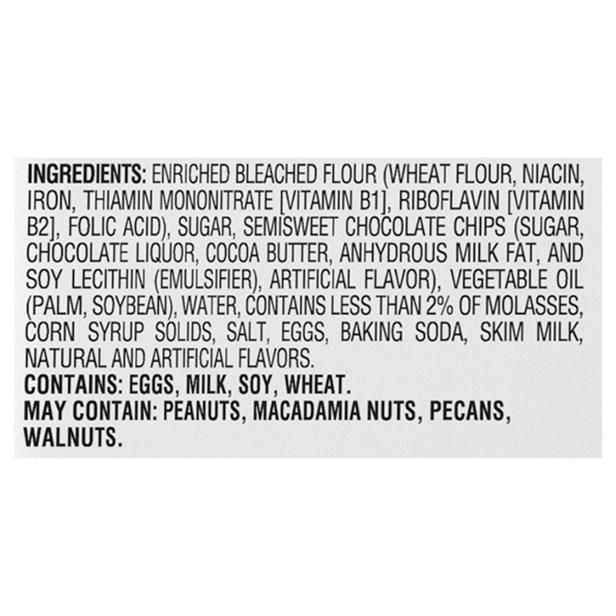 Enriched Bleached Flour (Wheat Flour, Niacin, Iron, Thiamin Mononitrate [Vitamin B1], Riboflavin [Vitamin B2], Folic Acid), Sugar, Semisweet Chocolate Chips (Sugar, Chocolate Liquor, Cocoa Butter, Anh…