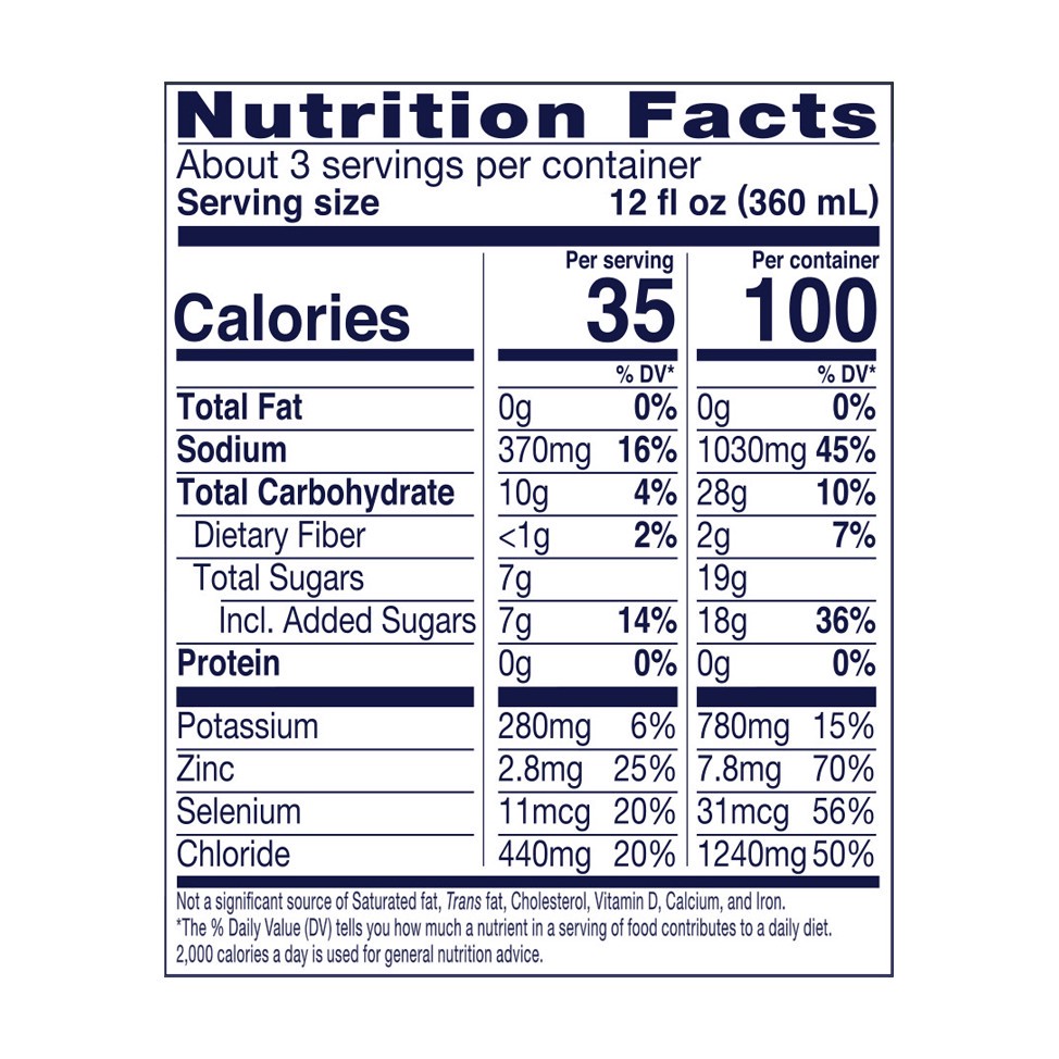 Water, Dextrose, Galactooligosaccharides, Less than 0.5% of: Citric Acid, Potassium Citrate, Natural and Artificial Flavors, Sodium Citrate, Sucralose, Acesulfame Potassium, Zinc Gluconate, Blue 1, Re…