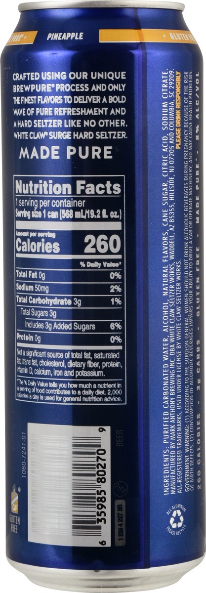 United States - Illinois - White Claw Hard Seltzer Surge is what happens when hard seltzer reaches new heights. With a hint of sweetness from the unmistakable pineapple flavor, this mouth-watering takā¦