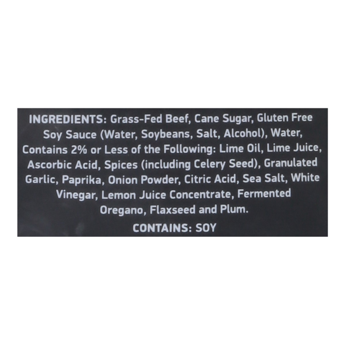 Grass-Fed Beef, Cane Sugar, Gluten Free Soy Sauce (Water, Soybeans, Salt, Alcohol), Water, Contains 2% or Less of the Following: Lime Oil, Lime Juice, Ascorbic Acid, Spices (Including Celery Seed), Gr…