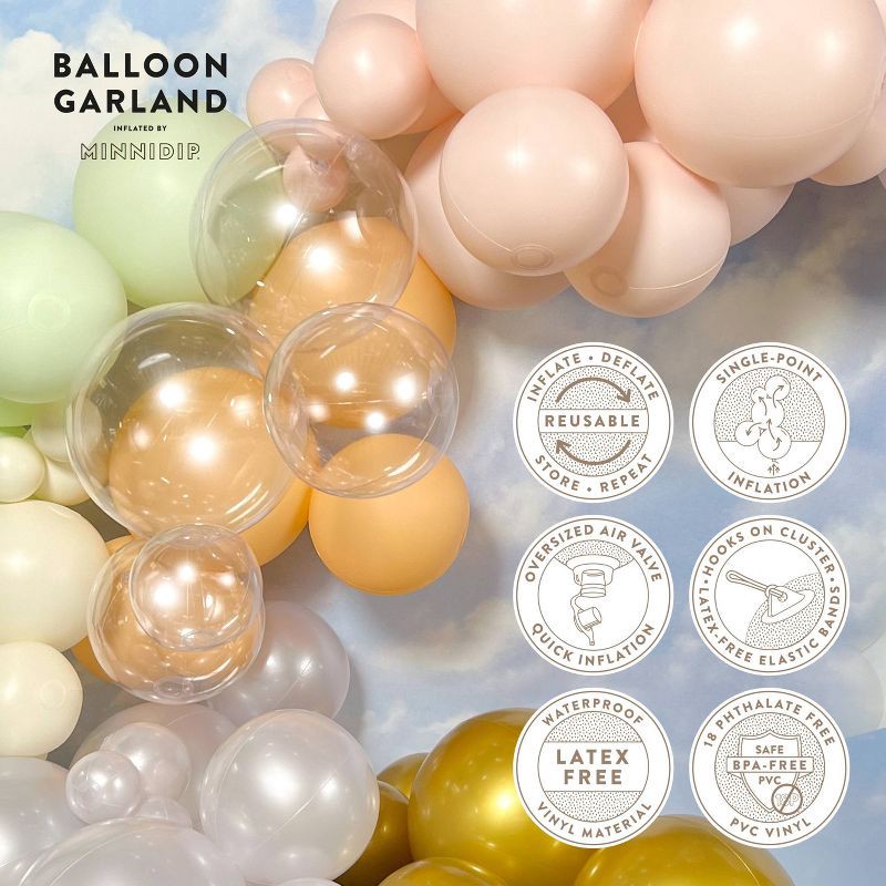 - BALLOON GARLAND by MINNIDIP is reusable, latex-free, and features a first-of-its-kind patent-pending, single-inflation-point for the look of a cluster of different-sized balloons with effortless set-up