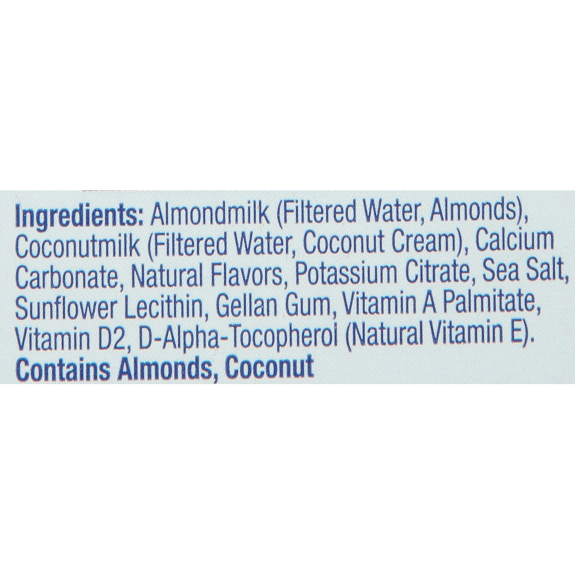 Almondmilk (Filtered Water, Almonds), Coconutmilk (Filtered Water, Coconut Cream), Calcium Carbonate, Natural Flavors, Potassium Citrate, Sea Salt, Sunflower Lecithin, Gellan Gum, D-Alpha-Tocopherol (…