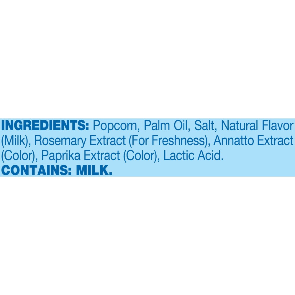 INGREDIENTS: POPCORN, PALM OIL, SALT, NATURAL FLAVOR (MILK), ROSEMARY EXTRACT (FOR FRESHNESS), ANNATTO EXTRACT (COLOR), PAPRIKA EXTRACT (COLOR), LACTIC ACID. CONTAINS: MILK