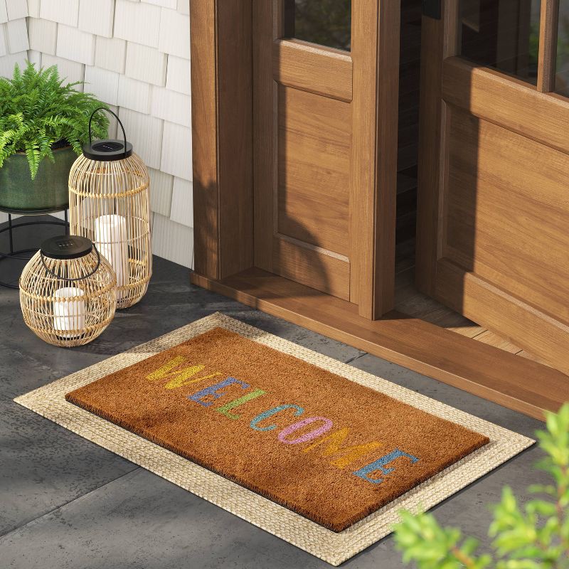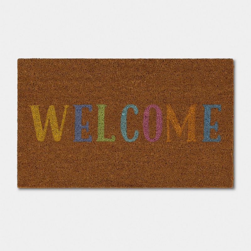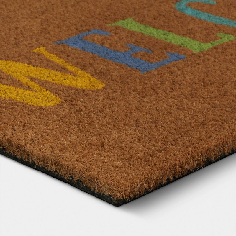 Greet your guests with a touch of charming elegance with this Easter ''Welcome'' Coir Doormat from Threshold™. The rectangular outdoor doormat features the text "Welcome" in multiple colors on a brown…