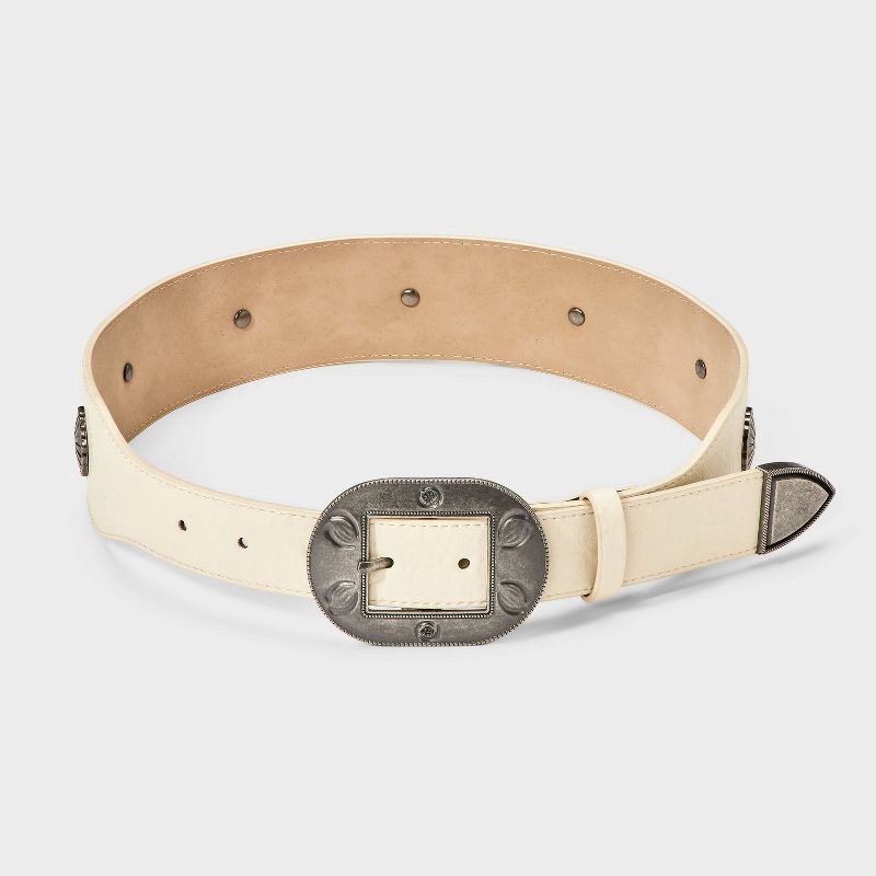 Bring a touch of cool Western style to your favorite ensembles with this Wide Buckle Western Studded Belt from Universal Thread™. Made from faux-leather polyurethane fabric in a cream hue, this belt f…