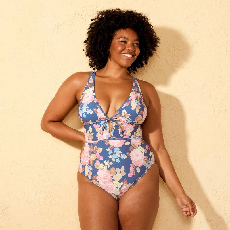 Women's Floral Print Plunge Tie Detail Cheeky Coverage One Piece Swimsuit - Shade & Shore™ Multi XL