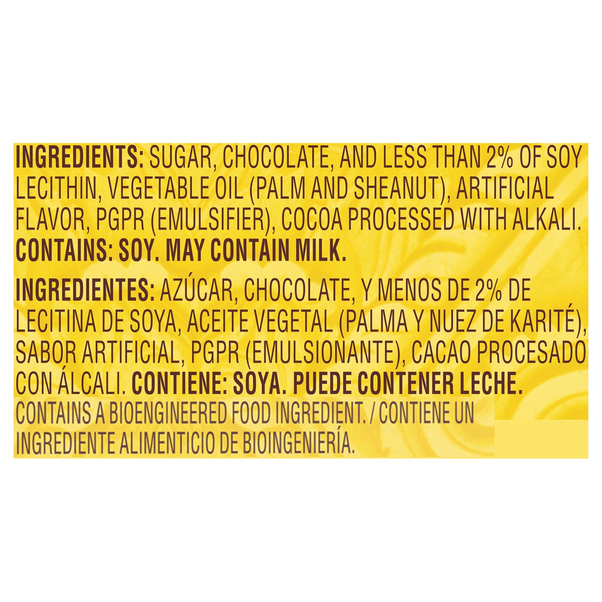 Sugar, Chocolate, and Less than 2% of Soy Lecithin, Vegetable Oil (Palm and Sheanut), Artificial Flavor, PGPR (Emulsifier), Cocoa Processed with Alkali.