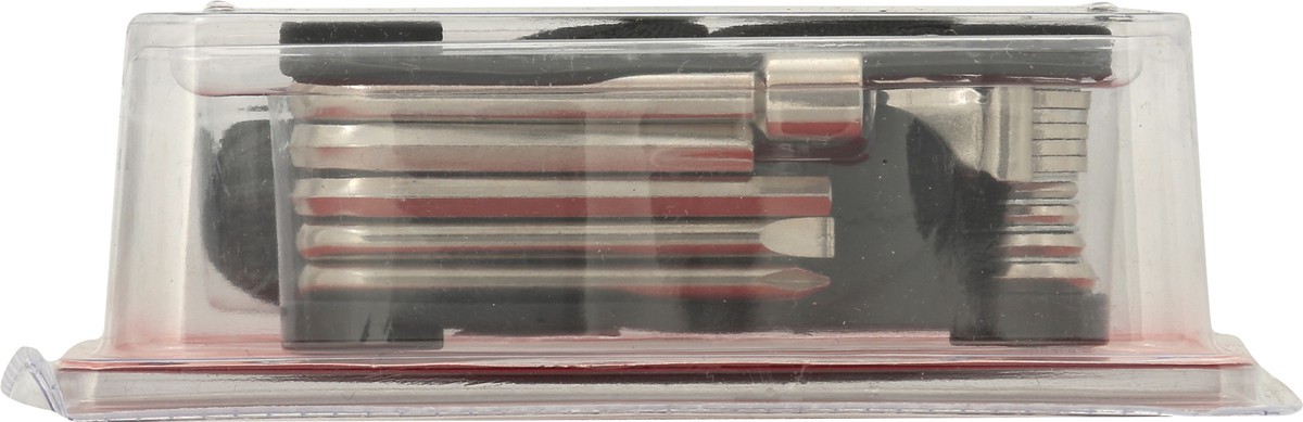 SW546 18 Tools in One: allen keys: 2 mm, 2.5 mm, 3 mm, 4 mm, 5 mm, 6 mm; box wrenches: 9 mm, 10 mm, 12 mm, 13 mm, 15 mm; phillips and flathead screwdrivers; spoke wrenches: 12 g, 13 g, 14 g; 8 mm sock…