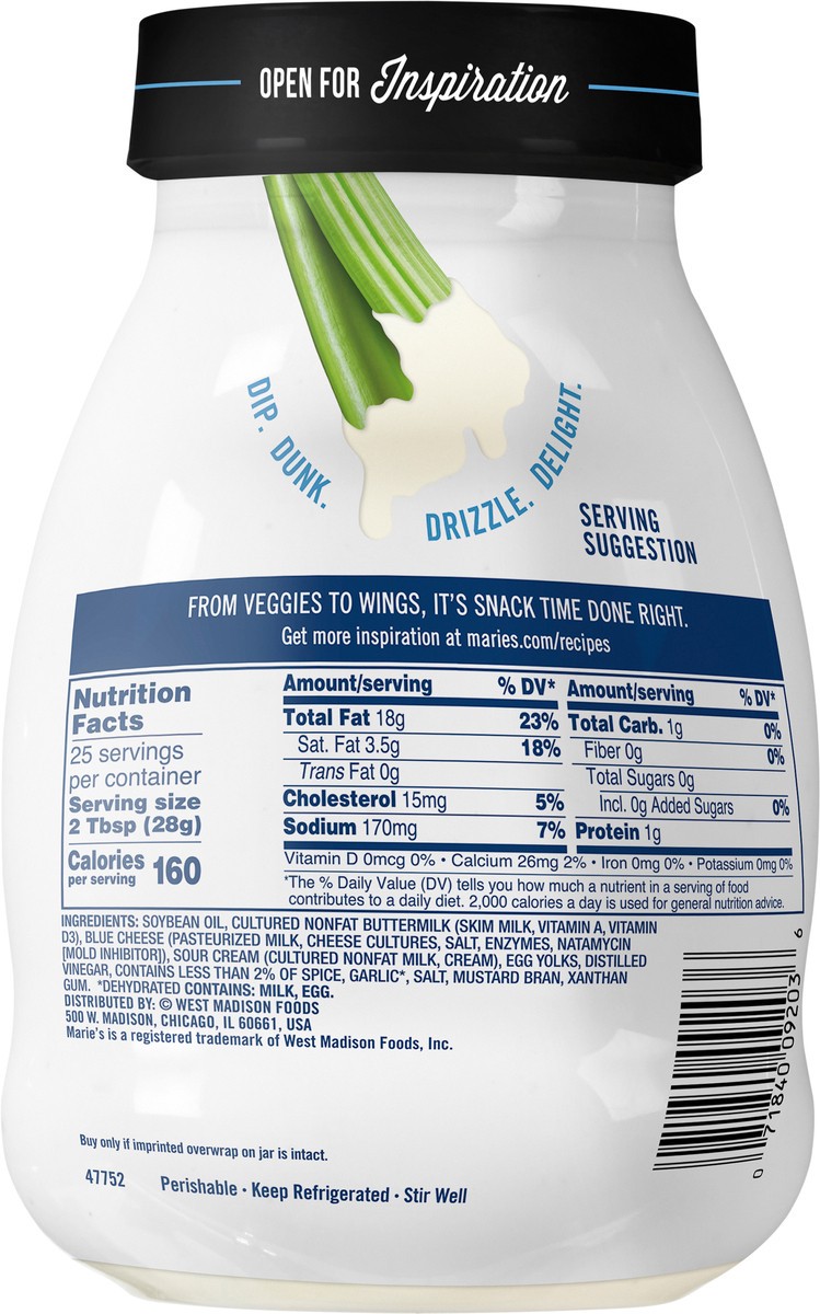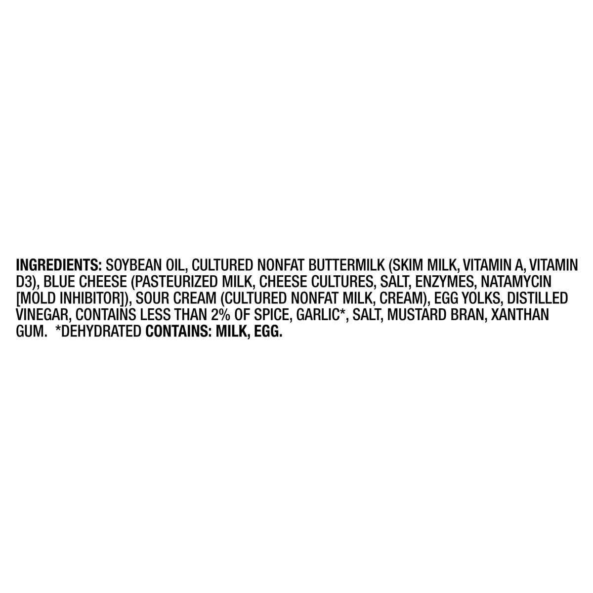 Soybean Oil, Cultured Nonfat Buttermilk (Skim Milk, Vitamin A, Vitamin D3), Blue Cheese (Pasteurized Milk, Cheese Cultures, Salt, Enzymes, Natamycin [Mold Inhibitor]), Sour Cream (Cultured Nonfat Milk…