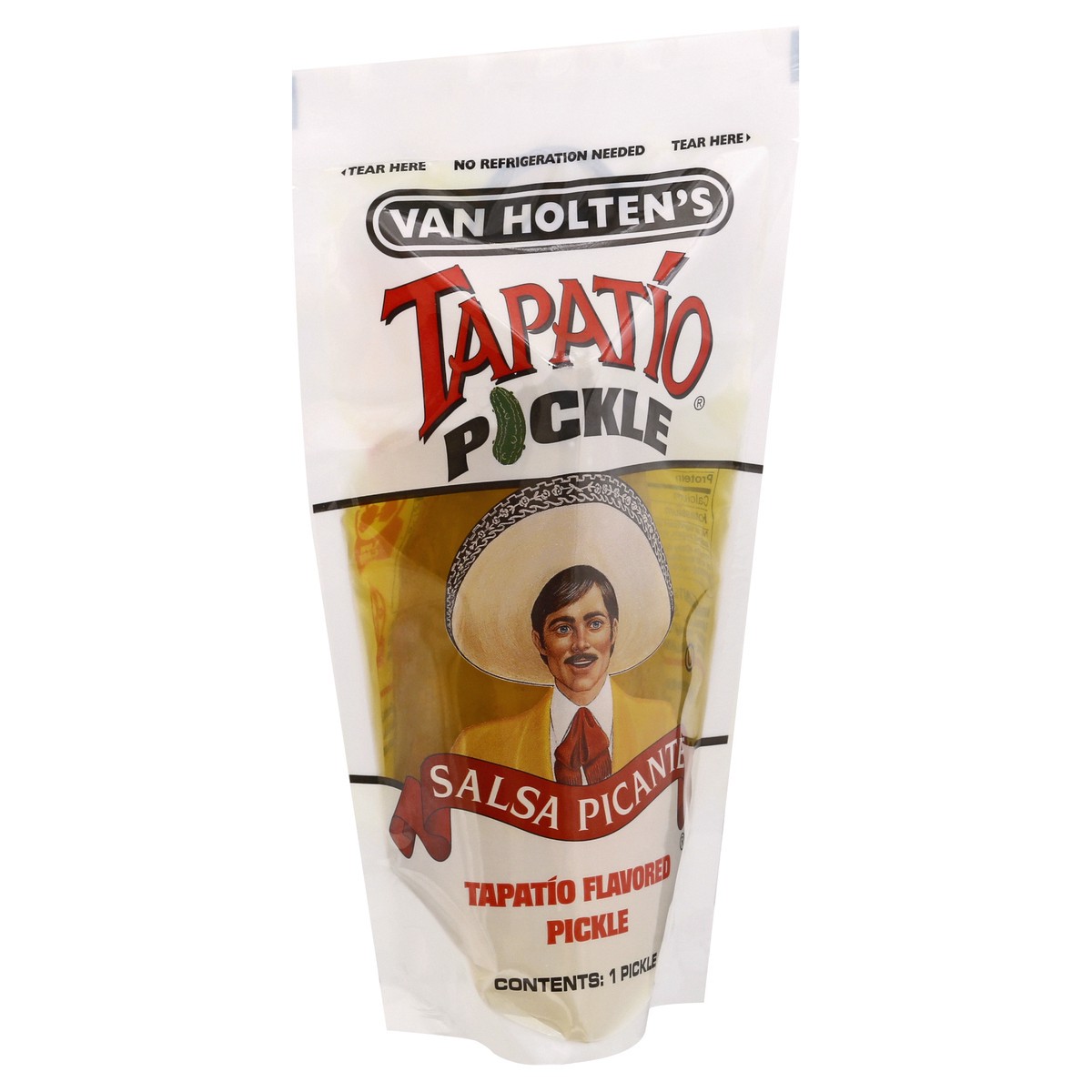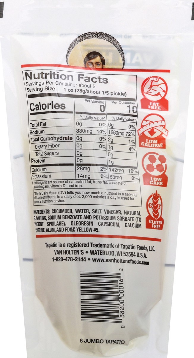 Tapatio flavored pickle. Fat free. Gluten free. Low calorie. Low carb. 6 jumbo tapatio. www.vanholtensfoods.com.