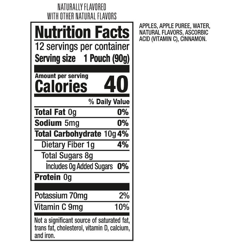 Apples, Apple Puree, Water, Natural Flavors, Ascorbic Acid (Vitamin C), Cinnamon.