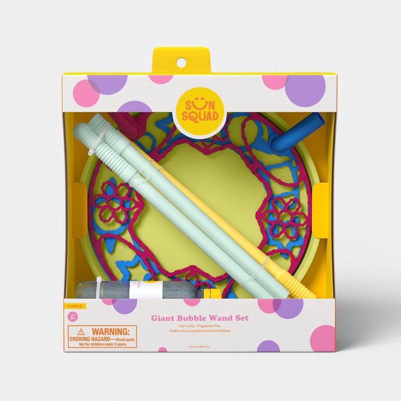 Dive into fun with the giant bubble wands and play sprinkler set from Sun Squad. Perfect for outdoor play, this set includes two bubble wands and an 8 fl oz play sprinkler, ensuring endless entertainm…