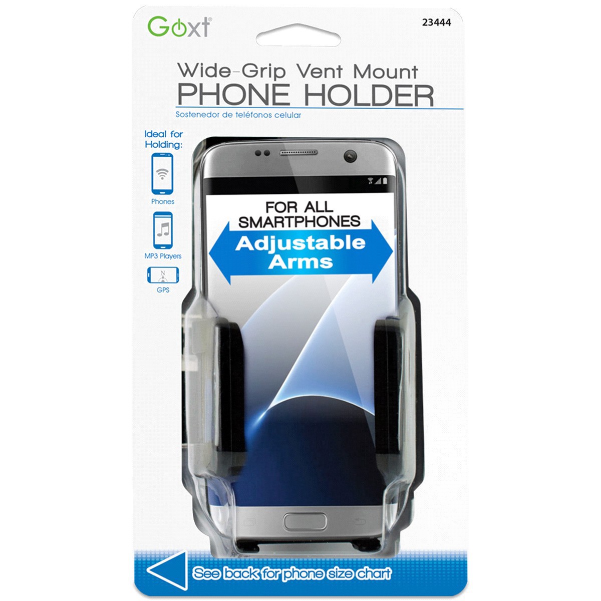 Keep your phone on hand and secure with a Goxt vent mount phone holder. This phone holder adjusts to fit the devices with widths from 1-1/2" to 3-3/4". The holder rotates 360 degrees for optimal vie…