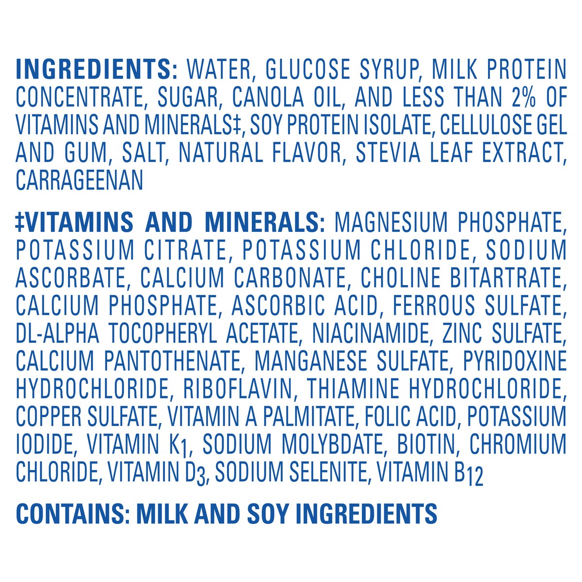 WATER, GLUCOSE SYRUP, MILK PROTEIN CONCENTRATE, SUGAR, CANOLA OIL, AND LESS THAN 2% OF VITAMINS AND MINERALS*, SOY PROTEIN ISOLATE, CELLULOSE GEL AND GUM, SALT, NATURAL FLAVOR, STEVIA LEAF EXTRACT, CA…