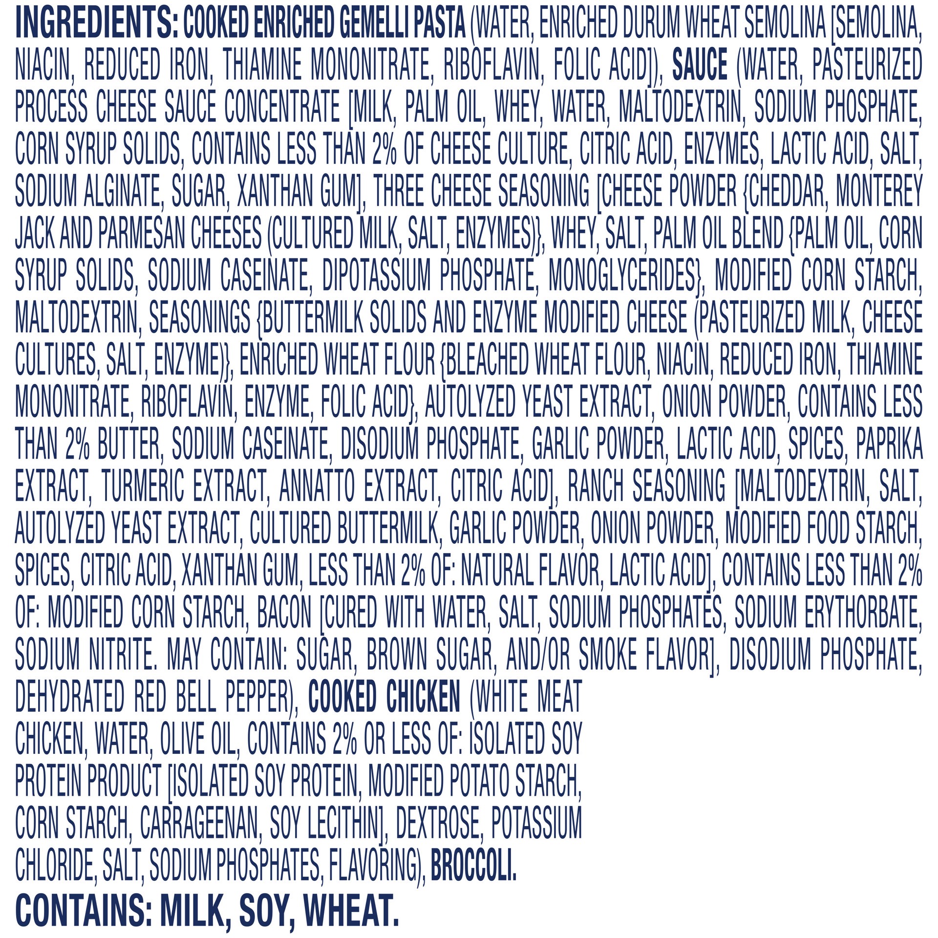 Cooked Enriched Gemelli Pasta (Water, Enriched Durum Wheat Semolina [Semolina Niacin, Reduced Iron, Thiamine Mononitrate, Riboflavin, Folic Acid]), Sauce (Water, Pasteurized Process Cheese Sauce Conce…