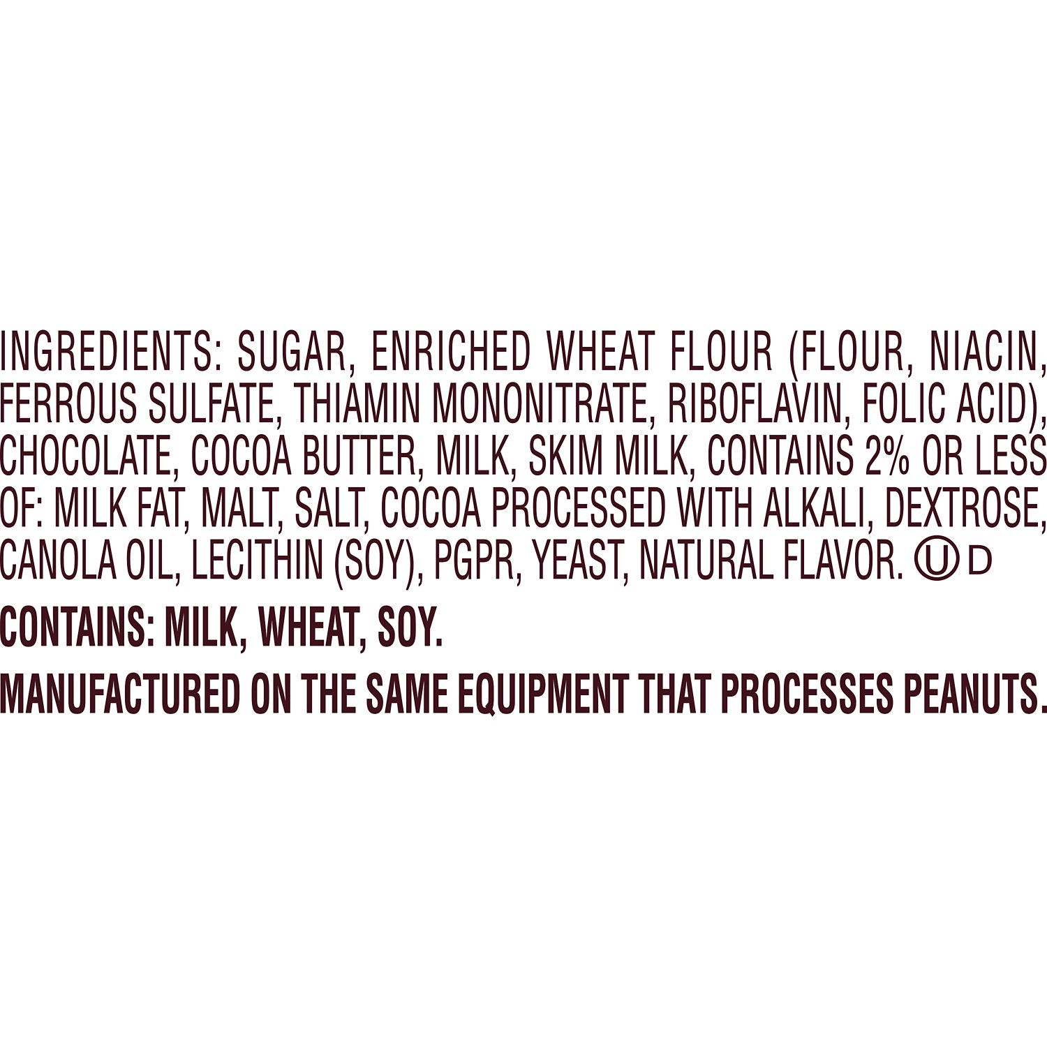 SUGAR; ENRICHED WHEAT FLOUR [FLOUR; NIACIN; FERROUS SULFATE; THIAMIN MONONITRATE; RIBOFLAVIN; FOLIC ACID]; CHOCOLATE; MILK; COCOA BUTTER; CONTAINS 2% OR LESS OF: MILK FAT; SALT; MALT; COCOA PROCESSED …