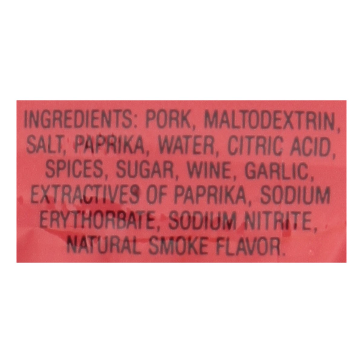 Pork, Maltodextrin, Salt, Paprika, Water, Citric Acid, Spices, Sugar, Wine, Garlic, Extractives of Paprika, Sodium Erythorbate, Sodium Nitrite, Natural Smoke Flavor.