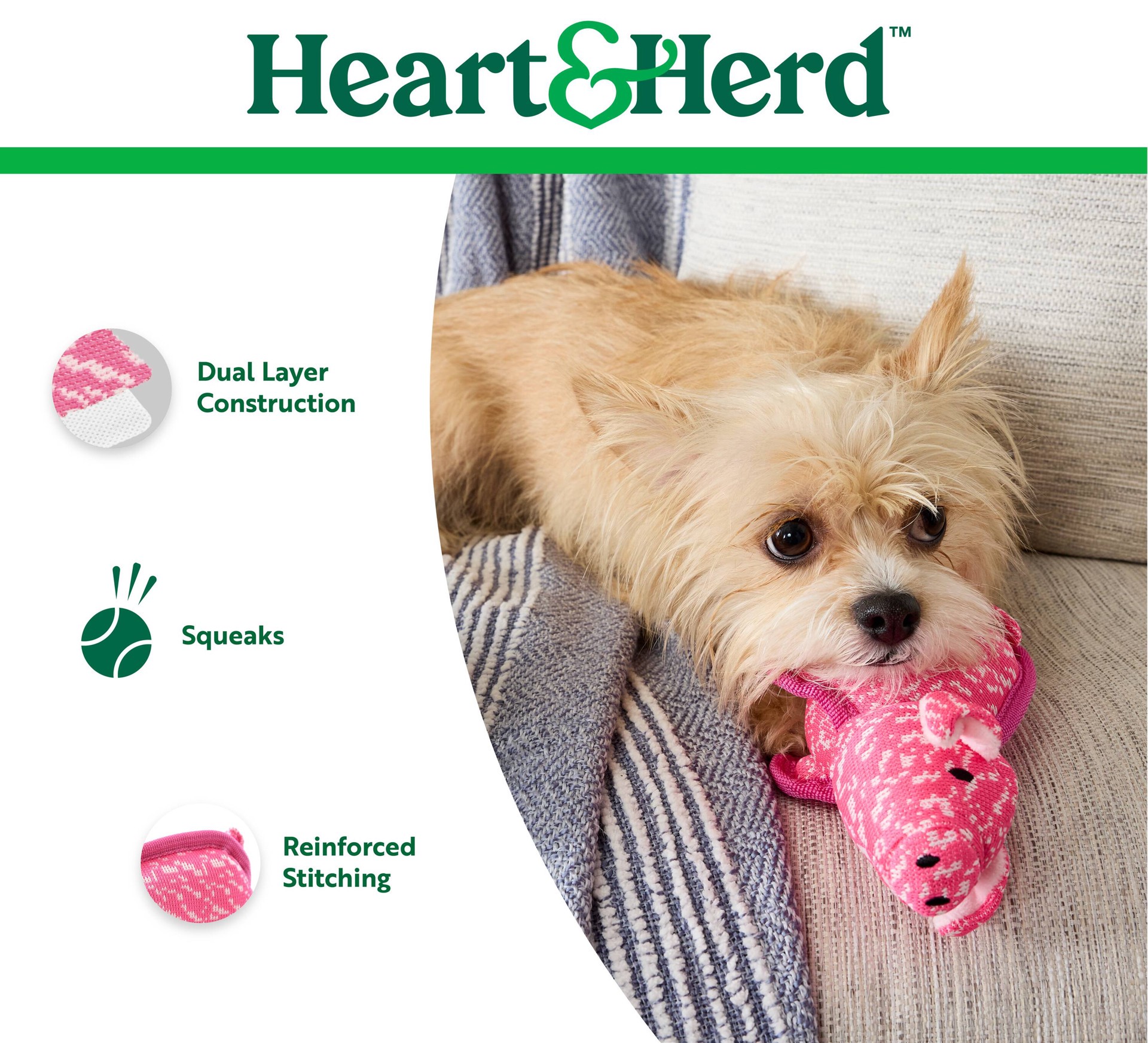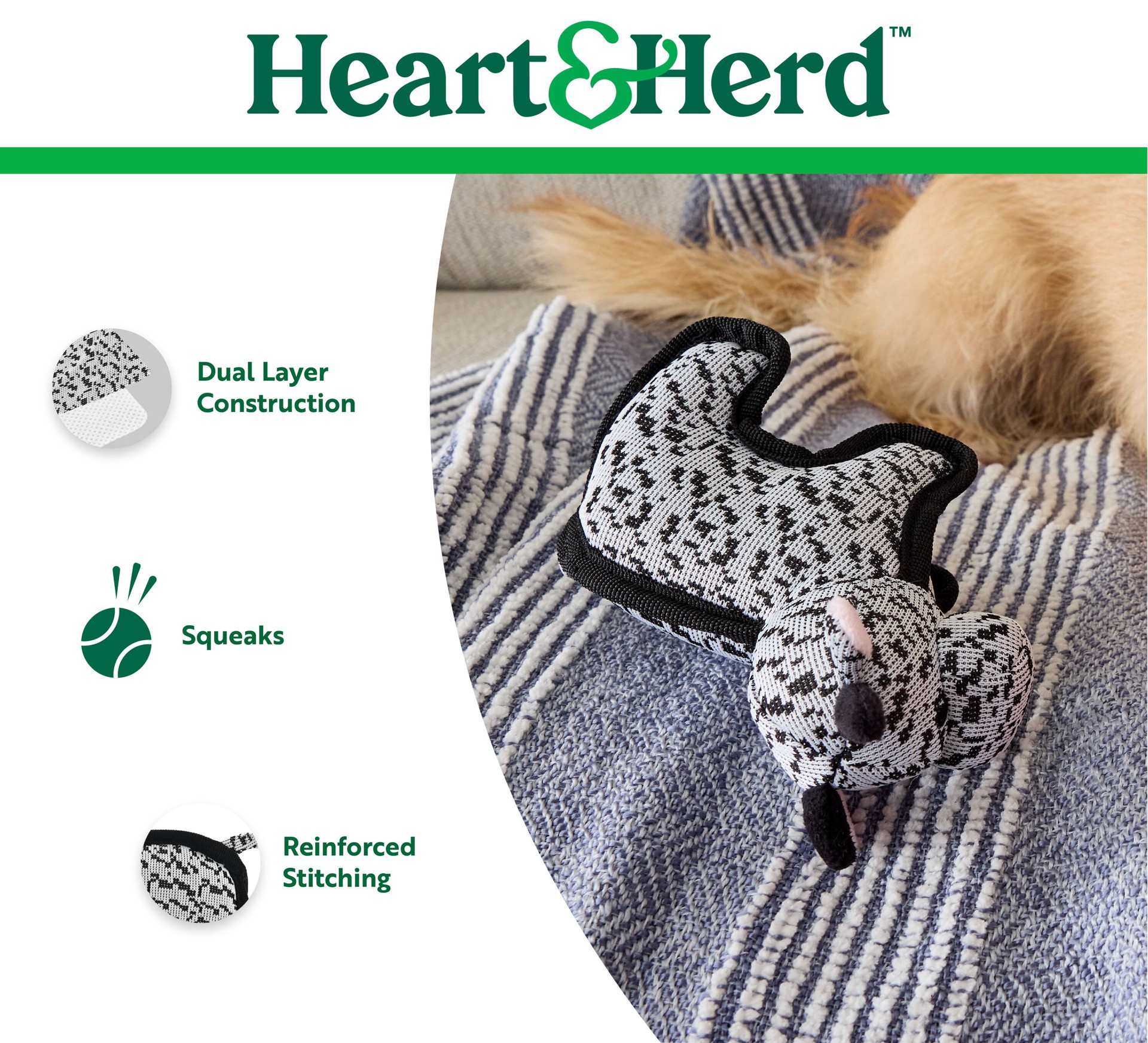 Heart & Herd Plush Cow dog toy is great for fetch, cuddles, and entertainment.. Squeaker inside to capture your dog's attention and keep them engaged.. Good for indoor play.. Made with a durable, dual…