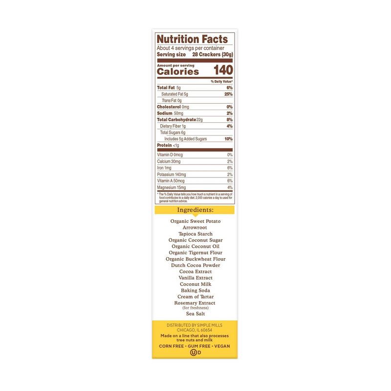 Organic Sweet Potato, Arrowroot, Tapioca Starch, Organic Coconut Sugar, Organic Coconut Oil, Organic Tigernut Flour, Organic Buckwheat Flour, Dutch Cocoa Powder, Cocoa Extract, Vanilla Extract, Coconu…
