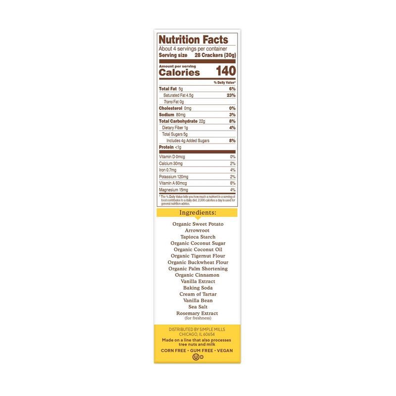 Organic Sweet Potato, Arrowroot, Tapioca Starch, Organic Coconut Sugar, Organic Coconut Oil, Organic Tigernut Flour, Organic Buckwheat Flour, Organic Palm Shortening, Organic Cinnamon, Vanilla Extract…