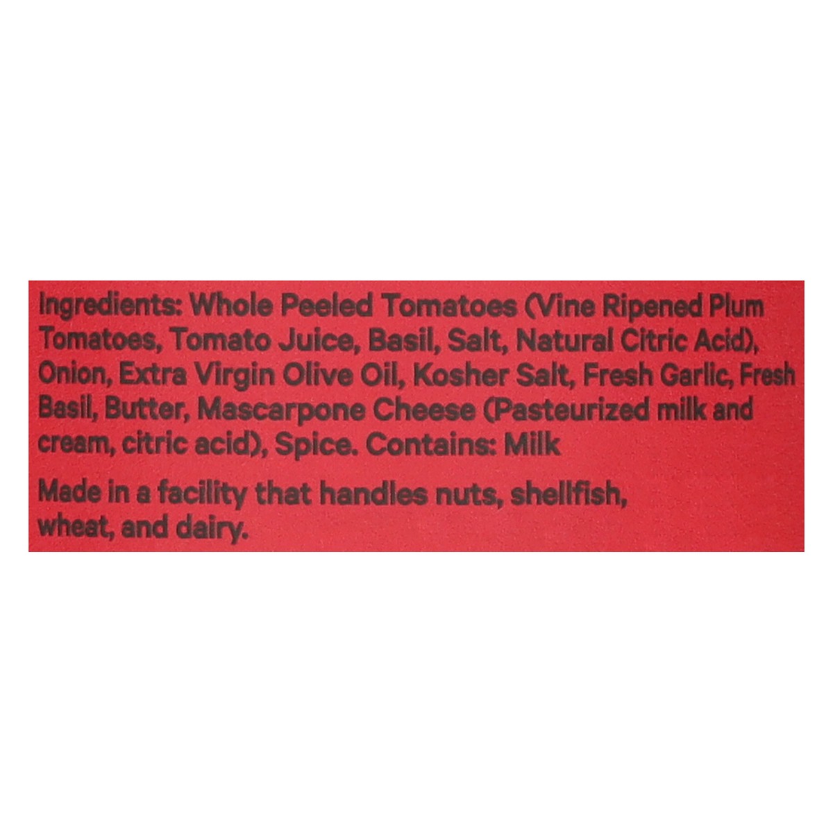 Whole Peeled Tomatoes (Vine Ripened Plum Tomatoes, Tomato Juice, Basil, Salt, Natural Citric Acid), Onion, Extra Virgin Olive Oil, Kosher Salt, Fresh Garlic, Fresh Basil, Butter, Mascarpone Cheese (Pa…