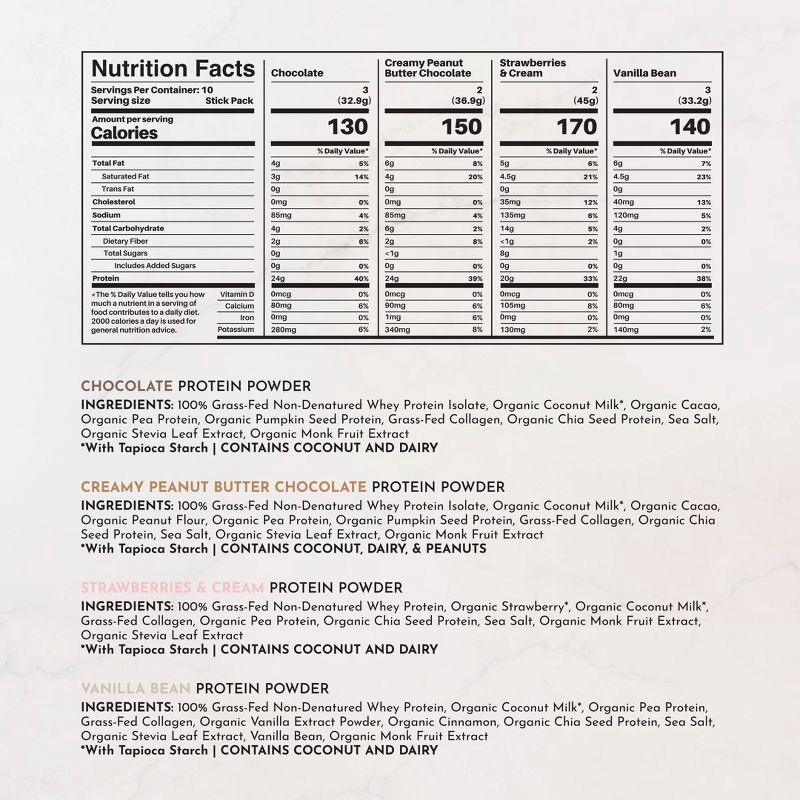 Vanilla Bean - 100% Grass-Fed Non-Denatured Whey Protein, Organic Coconut Milk*, Organic Pea Protein, Grass-Fed Collagen, Organic Vanilla Extract Powder, Organic Cinnamon, Organic Chia Seed Protein, S…