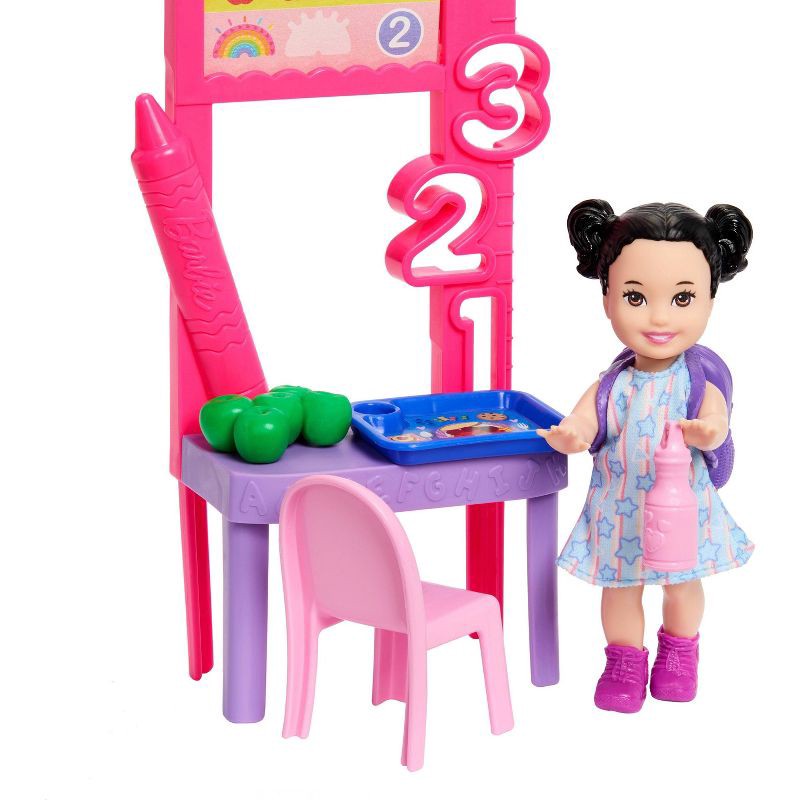 - The themed set includes a teaching board complete with counting lesson and a chair for the student doll, plus accessories like a backpack, safety scissors, lunch supplies and more!