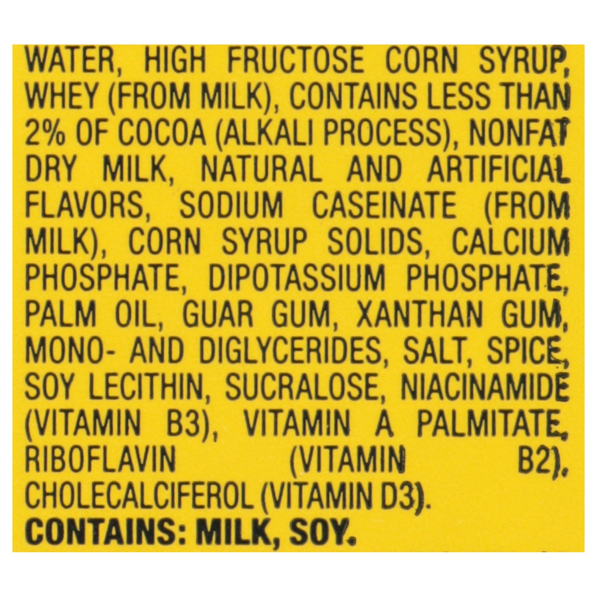 Water, High Fructose Corn Syrup, Whey (from Milk), Contains Less than 2% of Cocoa (Alkali Process), Nonfat Dry Milk, Natural and Artificial Flavors, Sodium Caseinate (from Milk), Corn Syrup Solids, Ca…