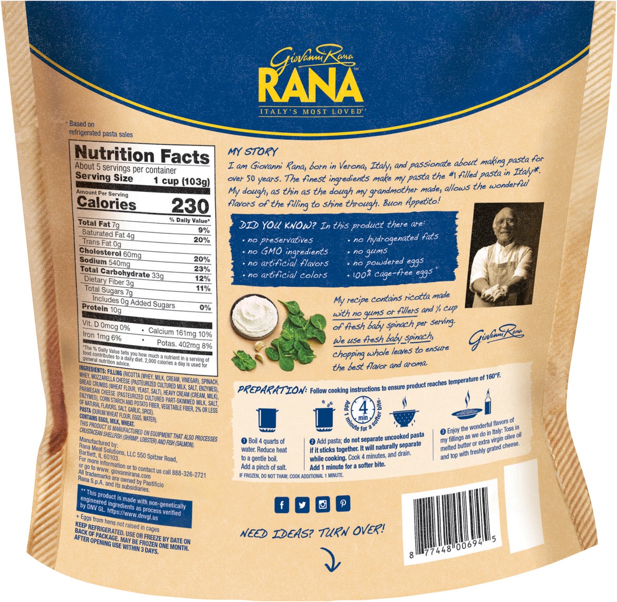 Giovanni Rana's spinach and ricotta ravioli is made with baby spinach & creamy ricotta cheese wrapped in thin pasta. Using high-quality ingredients and no preservatives, no powdered eggs, no gums, no …