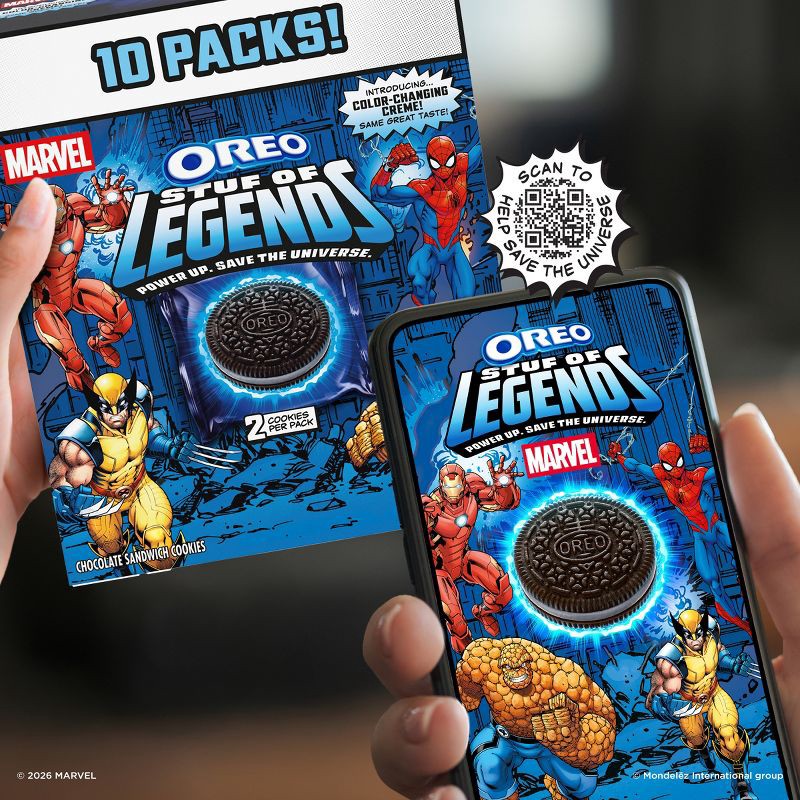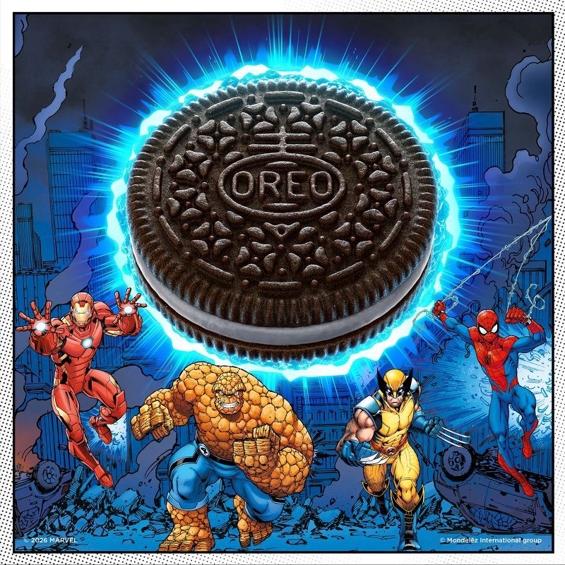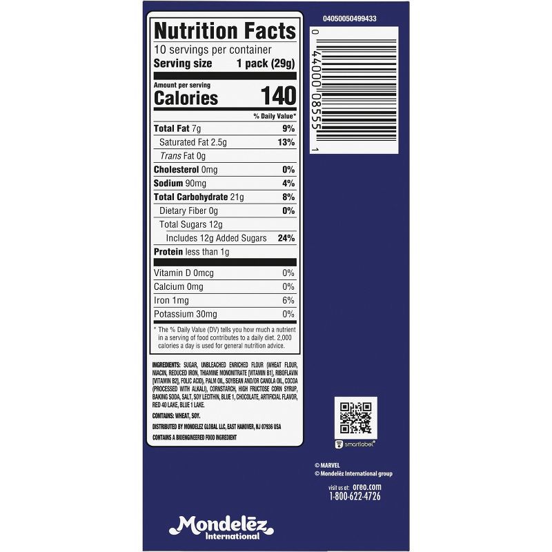 - OREO chocolate wafer cookies in 32 different cookie designs embossed with MARVEL characters like The Avengers, the Fantastic Four, Spider-Man, and X-Men (designs included may vary)