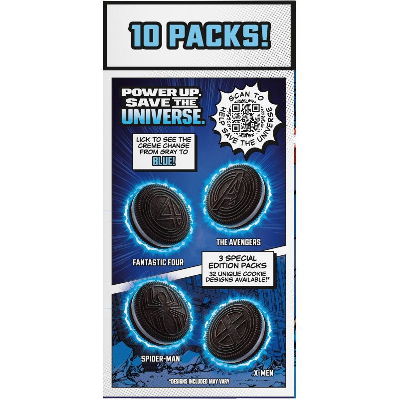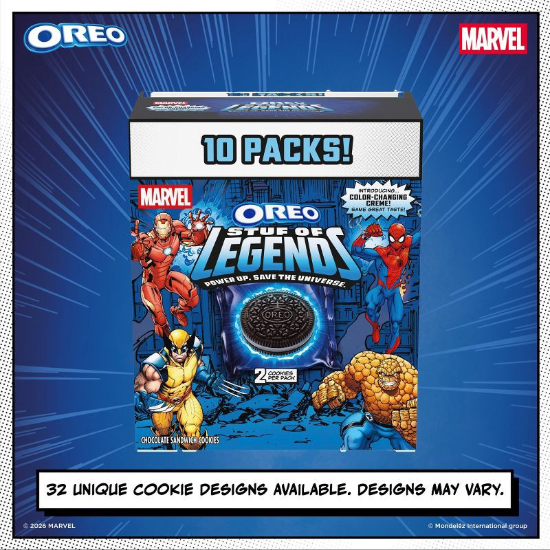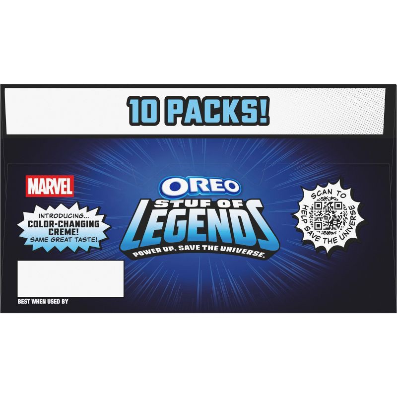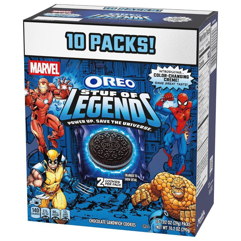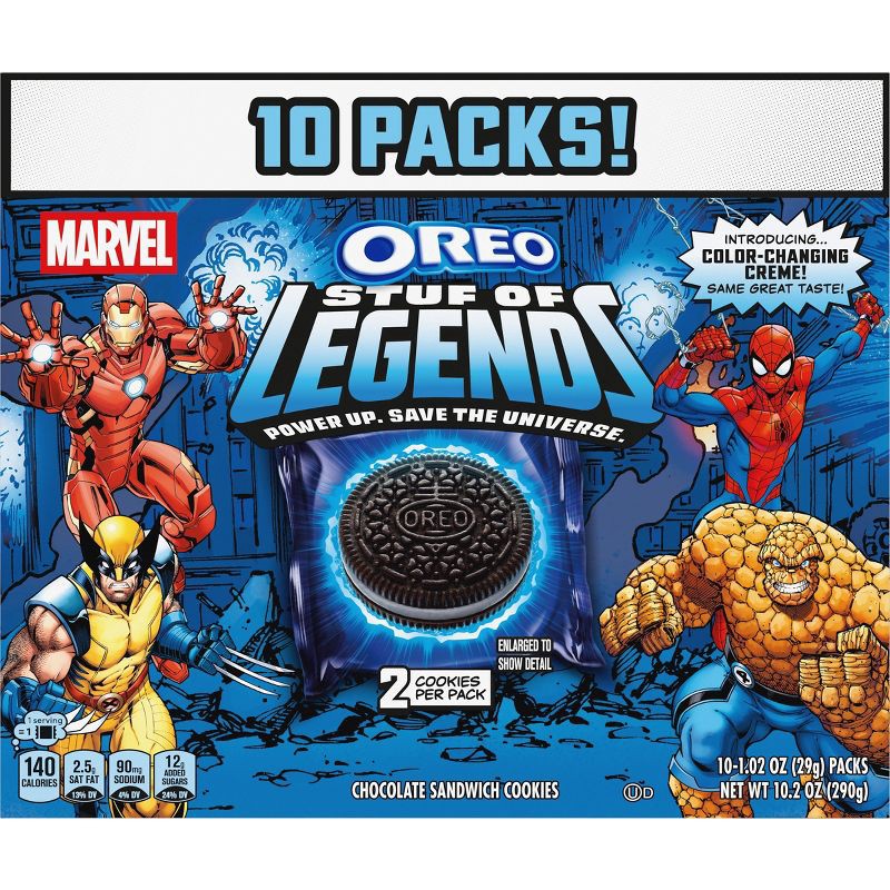 - Ten 1.02 oz snack packs of special edition MARVEL OREO Stuf of Legends Chocolate Sandwich Cookies; 2 cookies per pack