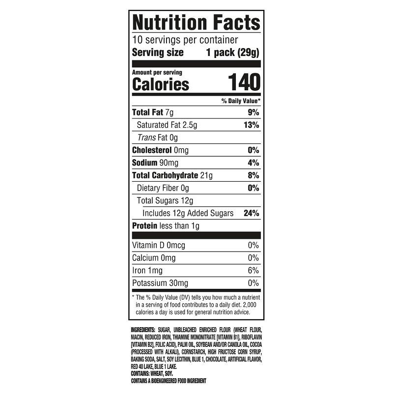 Sugar, Unbleached Enriched Flour (Wheat Flour, Niacin, Reduced Iron, Thiamine Mononitrate [Vitamin B1], Riboflavin [Vitamin B2], Folic Acid), Palm Oil, Soybean and/or Canola Oil, Cocoa (Processed with…