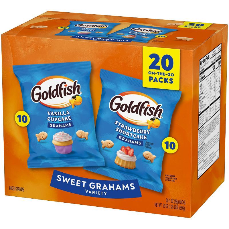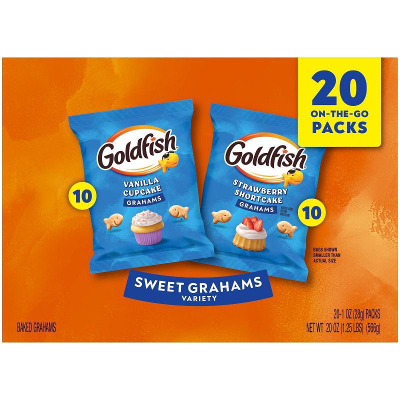 Enjoy snack-time goodness with this Goldfish Grahams variety pack with 20 individual on-the-go packs. Including 10 packs each of Vanilla Cupcake and Strawberry Shortcake Goldfish Grahams, this sweet s…