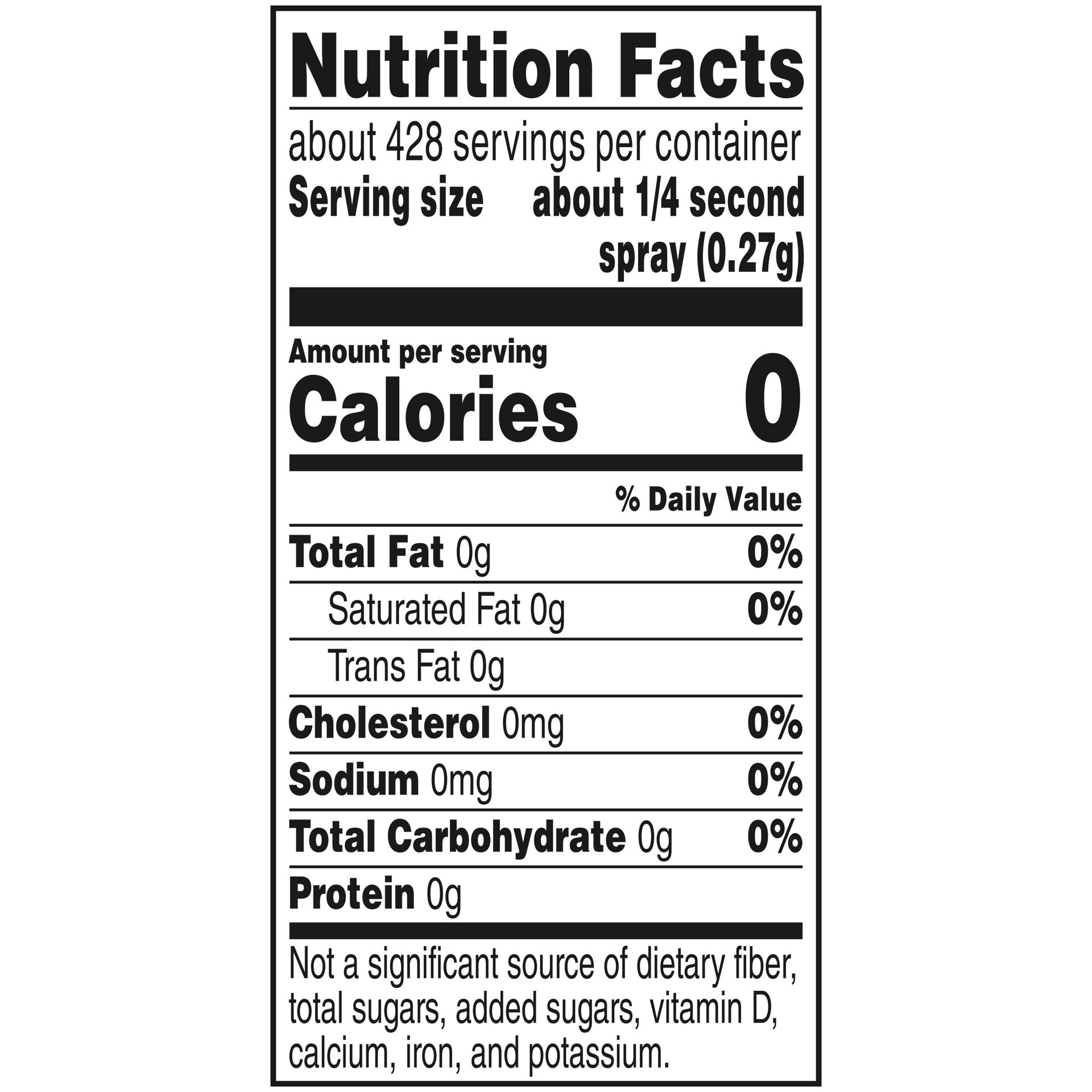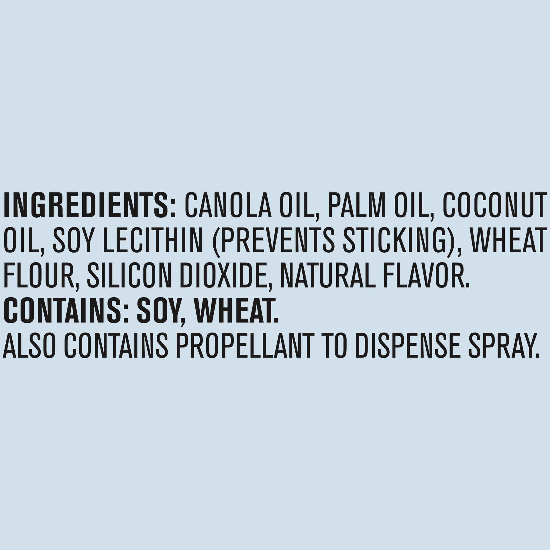 Canola Oil*, Palm Oil*, Coconut Oil*, Soy Lecithin (Prevents Sticking), Wheat Flour, Silicon Dioxide, Natural Flavor. CONTAINS: SOY, WHEAT *Adds a trivial amount of fat. Also contains propellant to di…